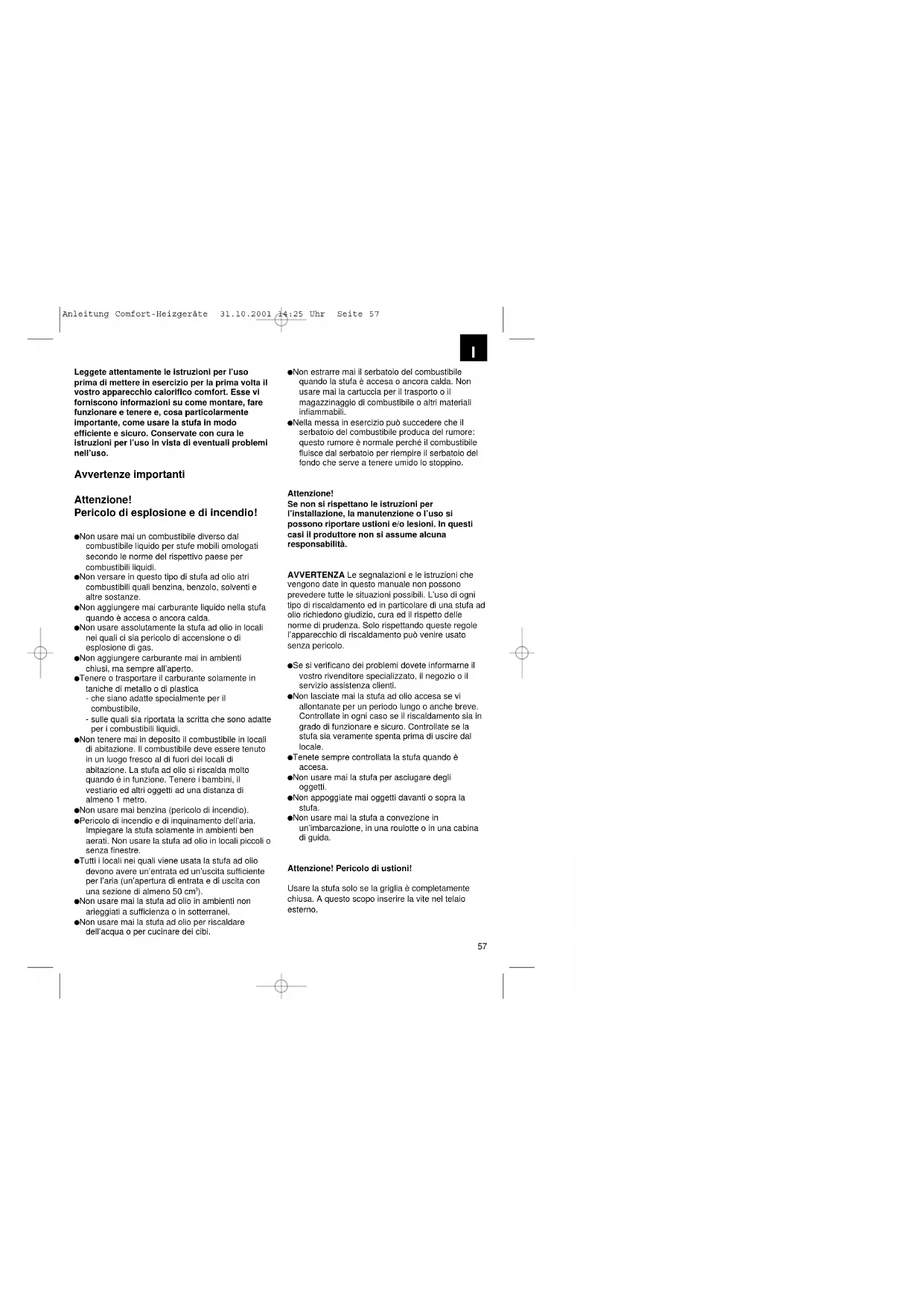 Anleitung Comfort-Heizgeräte 31.10.2001 14:25 Uhr Seite 56Leggete attentamente le istruzioni per l’uso prima di mettere in esercizio per la prima volta il vostro apparecchio calorifico comfort. Esse vi forniscono informazioni su come montare, fare funzionare e tenere e, cosa particolarmente importante, come usare la stufa in modo efficiente e sicuro. Conservate con cura le istruzioni per l’uso in vista di eventuali problemi nell’uso. Avvertenze importanti Attenzione! Pericolo di esplosione e di incendio! Non usare mai un combustibile diverso dal combustibile liquido per stufe mobili omologati secondo le norme del rispettivo paese per combustibili liquidi. Non versare in questo tipo di stufa ad olio atri combustibili quali benzina, benzolo, solventi e altre sostanze. Non aggiungere mai carburante liquido nella stufa quando è accesa o ancora calda. Non usare assolutamente la stufa ad olio in locali nei quali ci sia pericolo di accensione o di esplosione di gas. Non aggiungere carburante mai in ambienti chiusi, ma sempre all’aperto. Tenere o trasportare il carburante solamente in taniche di metallo o di plastica - che siano adatte specialmente per il combustibile, - sulle quali sia riportata la scritta che sono adatte per i combustibili liquidi. Non tenere mai in deposito il combustibile in locali di abitazione. Il combustibile deve essere tenuto in un luogo fresco al di fuori dei locali di abitazione. La stufa ad olio si riscalda molto quando é in funzione. Tenere i bambini, il vestiario ed altri oggetti ad una distanza di almeno 1 metro. Non usare mai benzina (pericolo di incendio). Pericolo di incendio e di inquinamento dell’aria. Impiegare la stufa solamente in ambienti ben aerati. Non usare la stufa ad olio in locali piccoli o senza finestre. Tutti i locali nei quali viene usata la stufa ad olio devono avere un’entrata ed un’uscita sufficiente per l’aria (un’apertura di entrata e di uscita con una sezione di almeno 50 cm