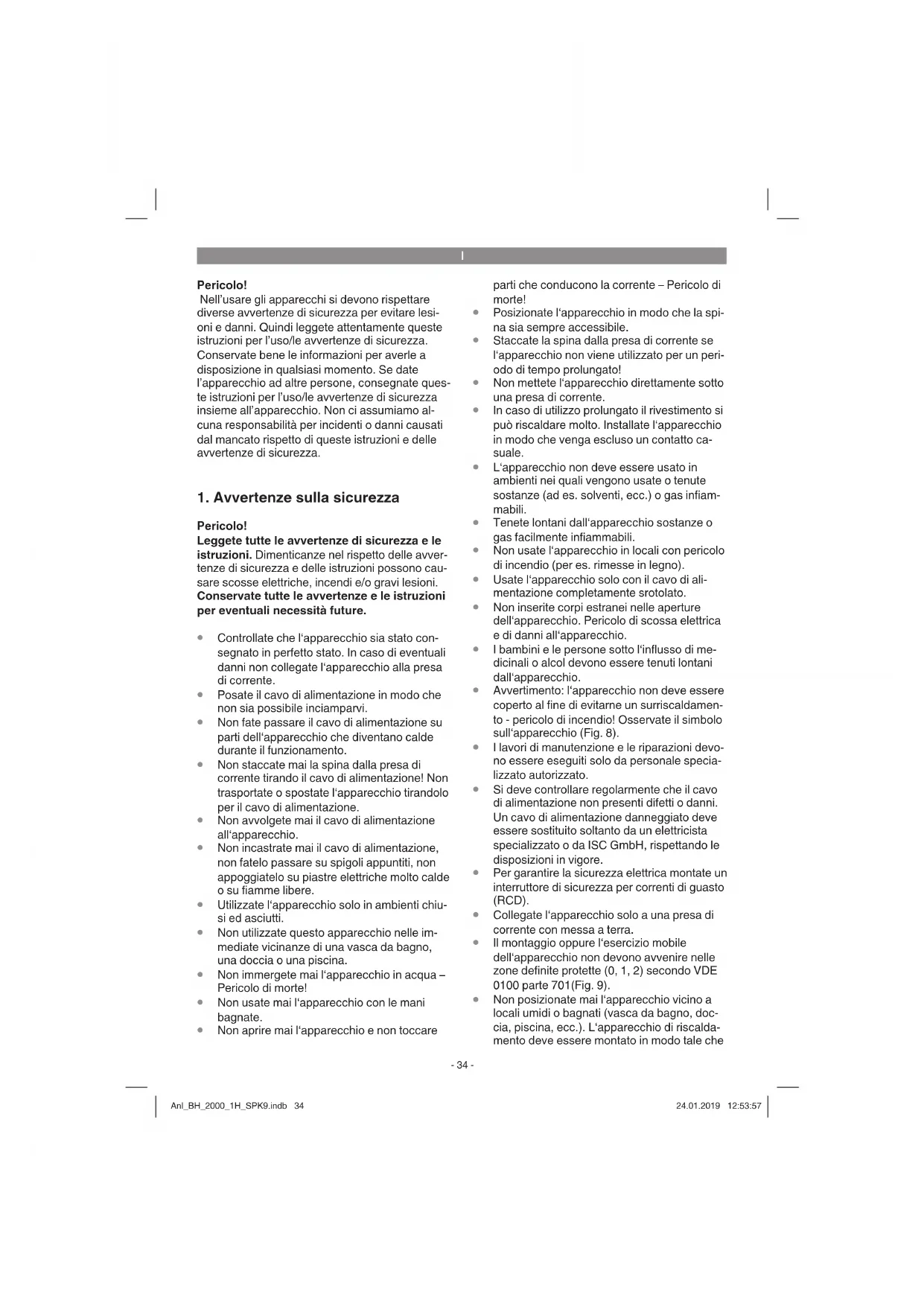 Non posizionate mai l‘apparecchio vicino a locali umidi o bagnati (vasca da bagno, doc- cia, piscina, ecc.). L‘apparecchio di riscalda- mento deve essere montato in modo tale che Anl_BH_2000_1H_SPK9.indb 34Anl_BH_2000_1H_SPK9.indb 34 24.01.2019 12:53:5724.01.2019 12:53:57I