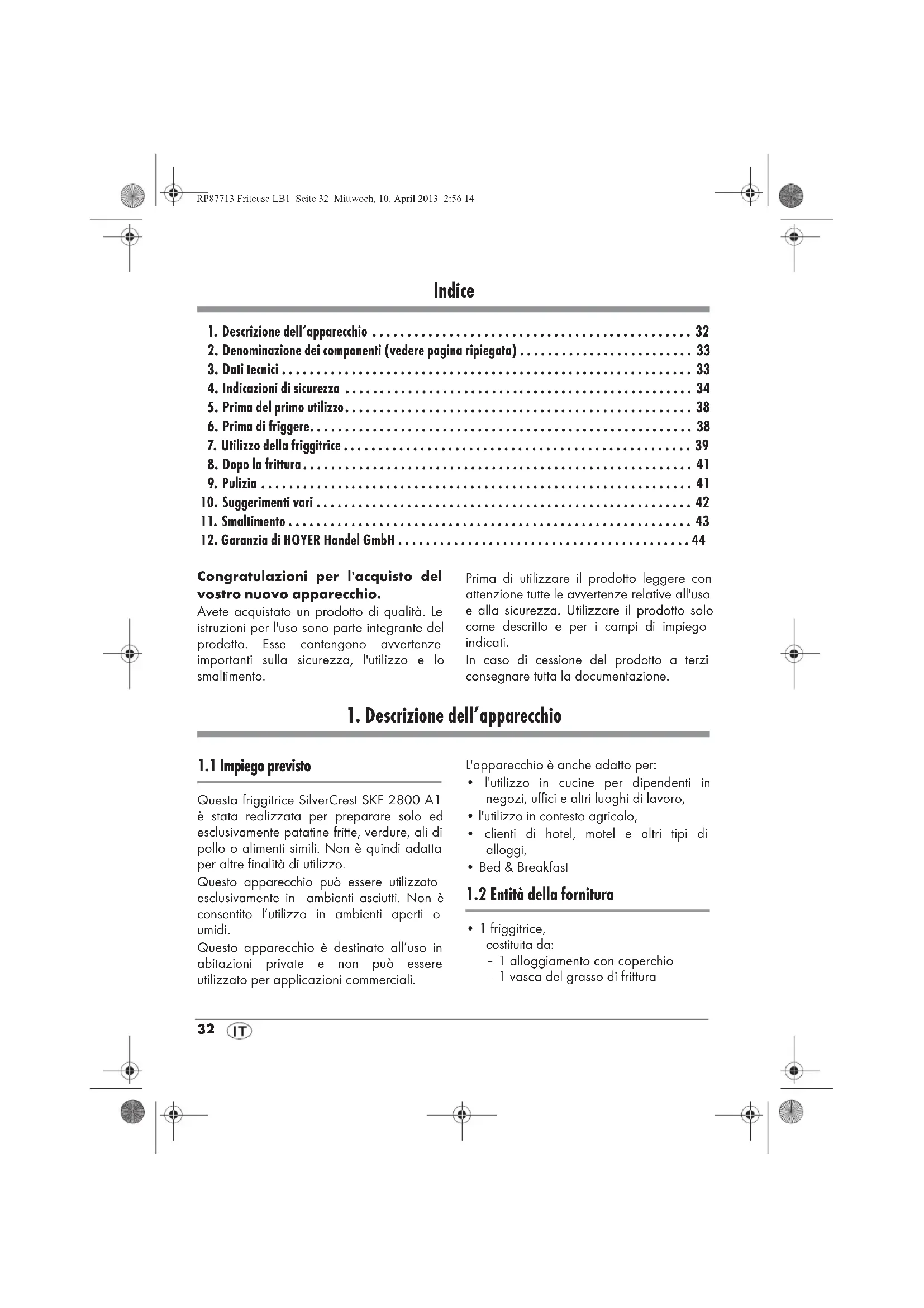 - 1 friggitrice, costituita da: – 1 alloggiamento con coperchio – 1 vasca del grasso di frittura RP87713 Friteuse LB1 Seite 32 Mittwoch, 10. April 2013 2:56 14SKF 2800 A1 33 – 1 cestello per friggere con impugnatura – 1 resistenza – 1 timer digitale – 1 pila a bottone AG13 (integrata nel timer)
