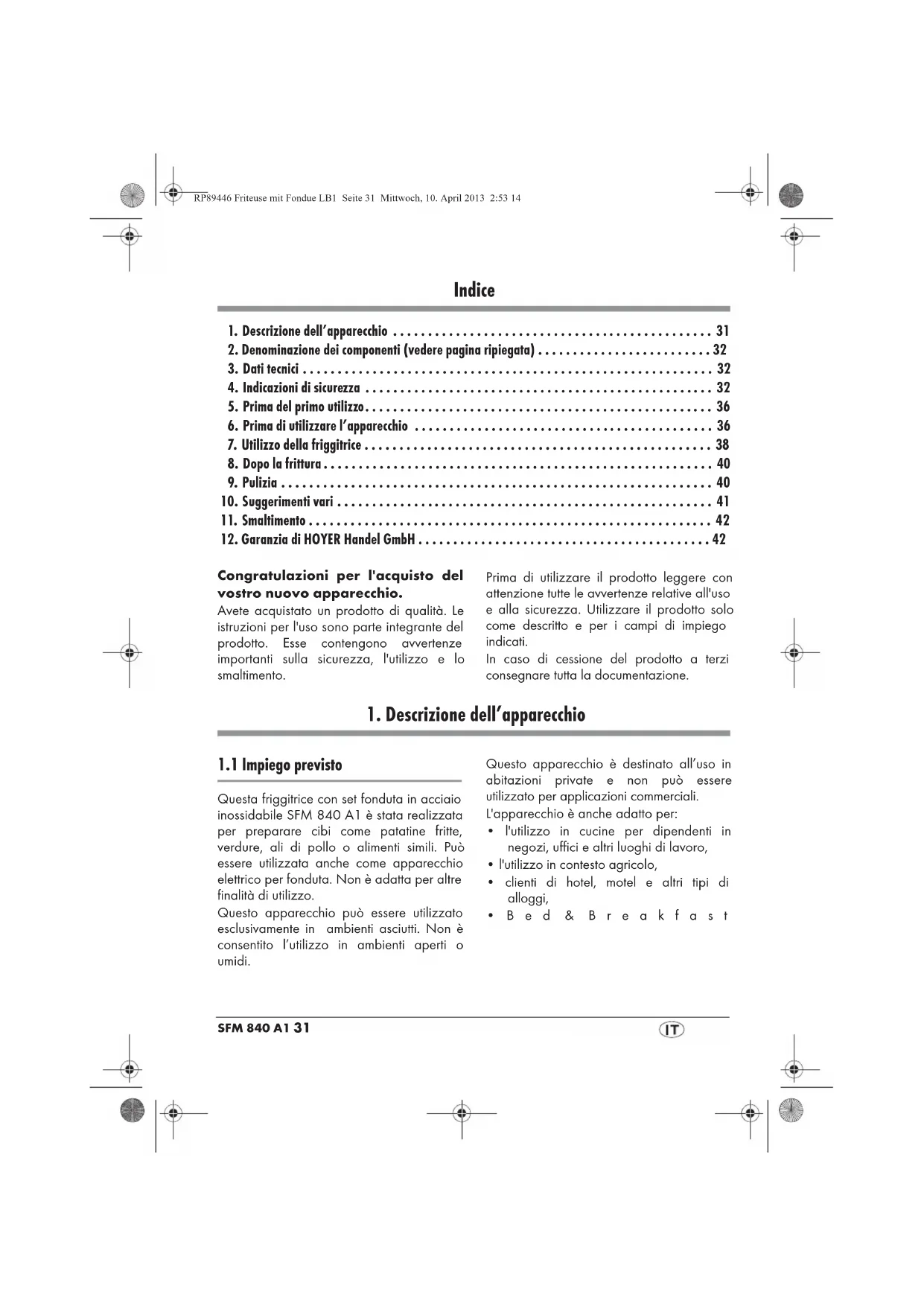 - Prima dell’utilizzo leggere accuratamente le presenti istruzioni per l’uso. Sono parte integrante dell’apparecchio e devono essere disponibili in qualsiasi momento. RP89446 Friteuse mit Fondue LB1 Seite 33 Mittwoch, 10. April 2013 2:53 1434