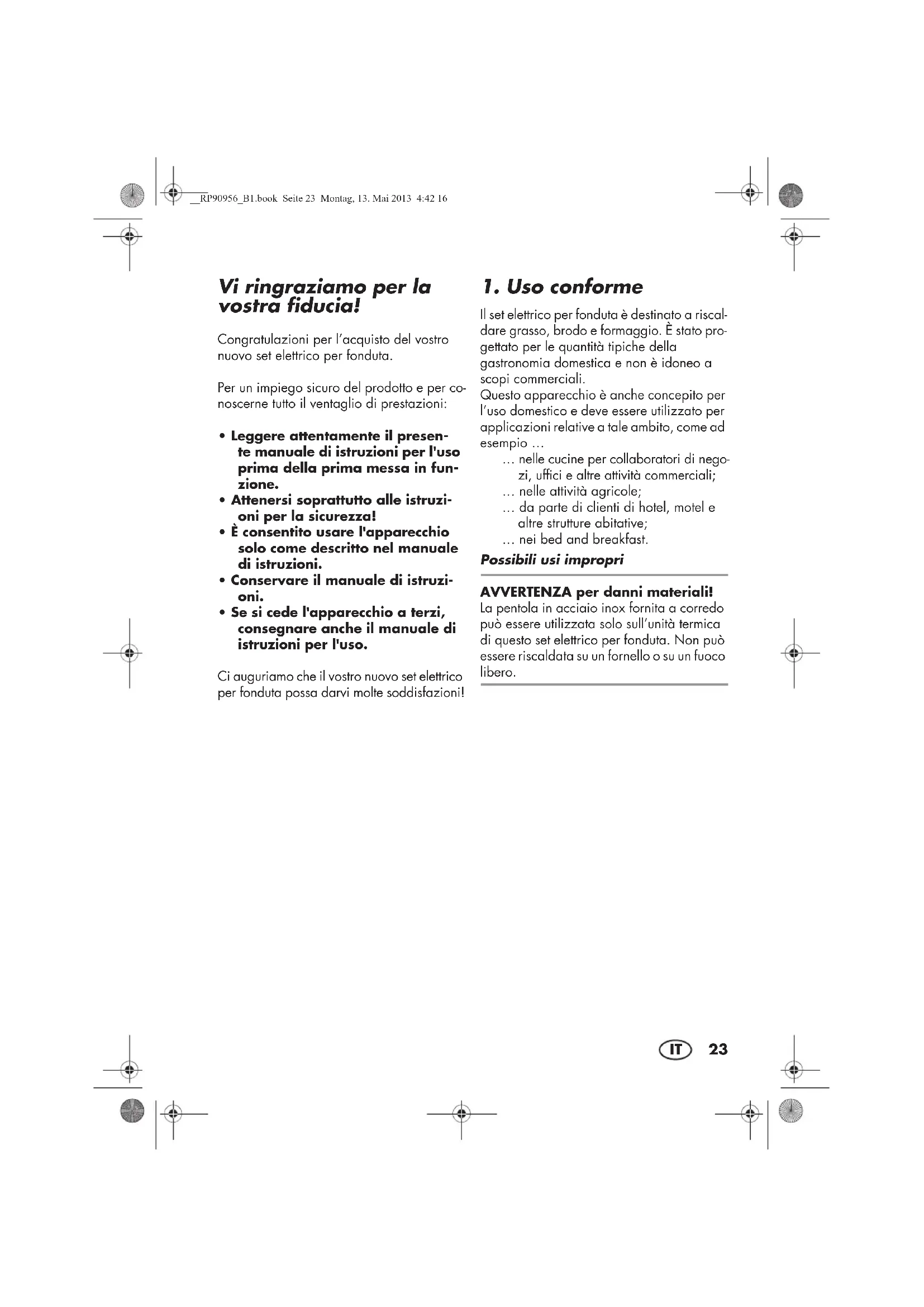 Il set elettrico per fonduta è destinato a riscal- dare grasso, brodo e formaggio. È stato pro- gettato per le quantità tipiche della gastronomia domestica e non è idoneo a scopi commerciali. Questo apparecchio è anche concepito per l’uso domestico e deve essere utilizzato per applicazioni relative a tale ambito, come ad esempio … … nelle cucine per collaboratori di nego- zi, uffici e altre attività commerciali; … nelle attività agricole; … da parte di clienti di hotel, motel e altre strutture abitative; … nei bed and breakfast. Possibili usi impropri AVVERTENZA per danni materiali! La pentola in acciaio inox fornita a corredo può essere utilizzata solo sull’unità termica di questo set elettrico per fonduta. Non può essere riscaldata su un fornello o su un fuoco libero. __RP90956_B1.book Seite 23 Montag, 13. Mai 2013 4:42 1624