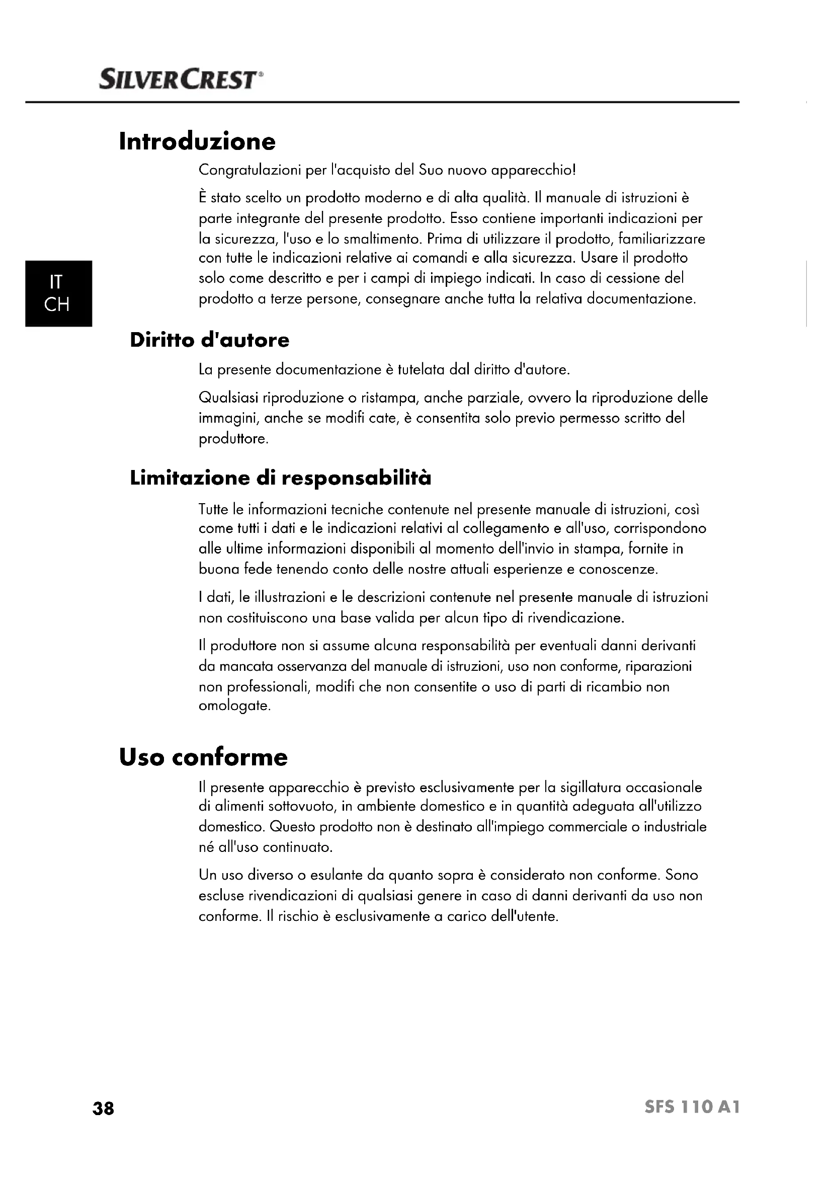 Introduzione Congratulazioni per l'acquisto del Suo nuovo apparecchio! È stato scelto un prodotto moderno e di alta qualità. Il manuale di istruzioni è parte integrante del presente prodotto. Esso contiene importanti indicazioni per la sicurezza, l'uso e lo smaltimento. Prima di utilizzare il prodotto, familiarizzare con tutte le indicazioni relative ai comandi e alla sicurezza. Usare il prodotto solo come descritto e per i campi di impiego indicati. In caso di cessione del prodotto a terze persone, consegnare anche tutta la relativa documentazione. Diritto d'autore La presente documentazione è tutelata dal diritto d'autore. Qualsiasi riproduzione o ristampa, anche parziale, ovvero la riproduzione delle immagini, anche se modifi cate, è consentita solo previo permesso scritto del produttore. Limitazione di responsabilità Tutte le informazioni tecniche contenute nel presente manuale di istruzioni, così come tutti i dati e le indicazioni relativi al collegamento e all'uso, corrispondono alle ultime informazioni disponibili al momento dell'invio in stampa, fornite in buona fede tenendo conto delle nostre attuali esperienze e conoscenze. I dati, le illustrazioni e le descrizioni contenute nel presente manuale di istruzioni non costituiscono una base valida per alcun tipo di rivendicazione. Il produttore non si assume alcuna responsabilità per eventuali danni derivanti da mancata osservanza del manuale di istruzioni, uso non conforme, riparazioni non professionali, modifi che non consentite o uso di parti di ricambio non omologate. Uso conforme Il presente apparecchio è previsto esclusivamente per la sigillatura occasionale di alimenti sottovuoto, in ambiente domestico e in quantità adeguata all'utilizzo domestico. Questo prodotto non è destinato all'impiego commerciale o industriale né all'uso continuato. Un uso diverso o esulante da quanto sopra è considerato non conforme. Sono escluse rivendicazioni di qualsiasi genere in caso di danni derivanti da uso non conforme. Il rischio è esclusivamente a carico dell'utente. IB_104351_SFS110A1_LB1.indb 38 04.12.14 08:4639 SFS 110 A1