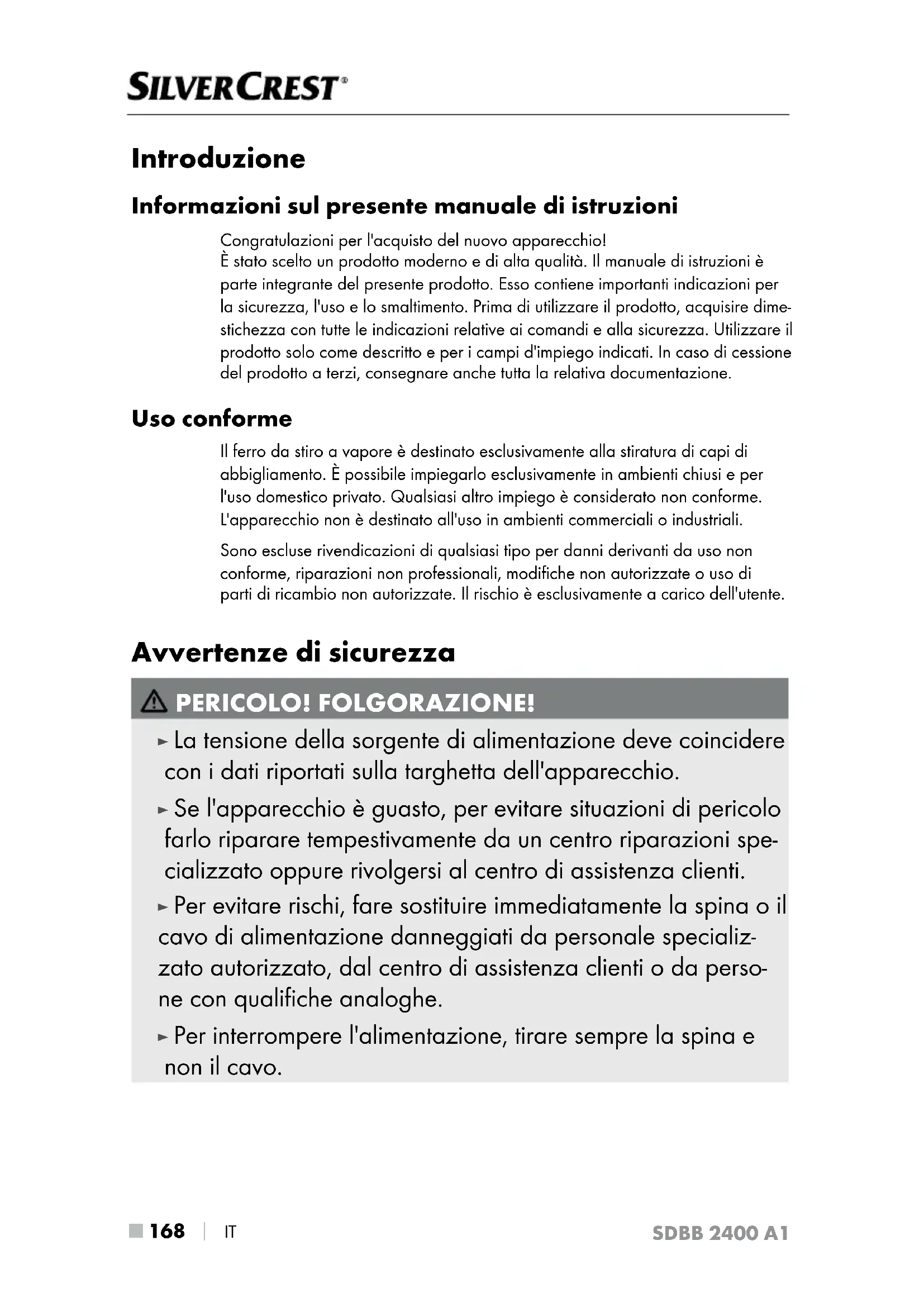 IT Introduzione Informazioni sul presente manuale di istruzioni Congratulazioni per l'acquisto del nuovo apparecchio! È stato scelto un prodotto moderno e di alta qualità. Il manuale di istruzioni è parte integrante del presente prodotto. Esso contiene importanti indicazioni per la sicurezza, l'uso e lo smaltimento. Prima di utilizzare il prodotto, acquisire dime- stichezza con tutte le indicazioni relative ai comandi e alla sicurezza. Utilizzare il prodotto solo come descritto e per i campi d'impiego indicati. In caso di cessione del prodotto a terzi, consegnare anche tutta la relativa documentazione. Uso conforme Il ferro da stiro a vapore è destinato esclusivamente alla stiratura di capi di abbigliamento. È possibile impiegarlo esclusivamente in ambienti chiusi e per l'uso domestico privato. Qualsiasi altro impiego è considerato non conforme. L'apparecchio non è destinato all'uso in ambienti commerciali o industriali. Sono escluse rivendicazioni di qualsiasi tipo per danni derivanti da uso non conforme, riparazioni non professionali, modifiche non autorizzate o uso di parti di ricambio non autorizzate. Il rischio è esclusivamente a carico dell'utente. Avvertenze di sicurezza PERICOLO! FOLGORAZIONE! ► La tensione della sorgente di alimentazione deve coincidere con i dati riportati sulla targhetta dell'apparecchio. ► Se l'apparecchio è guasto, per evitare situazioni di pericolo farlo riparare tempestivamente da un centro riparazioni spe- cializzato oppure rivolgersi al centro di assistenza clienti. ► Per evitare rischi, fare sostituire immediatamente la spina o il cavo di alimentazione danneggiati da personale specializ- zato autorizzato, dal centro di assistenza clienti o da perso- ne con qualifiche analoghe. ► Per interrompere l'alimentazione, tirare sempre la spina e non il cavo.SDBB 2400 A1 IT