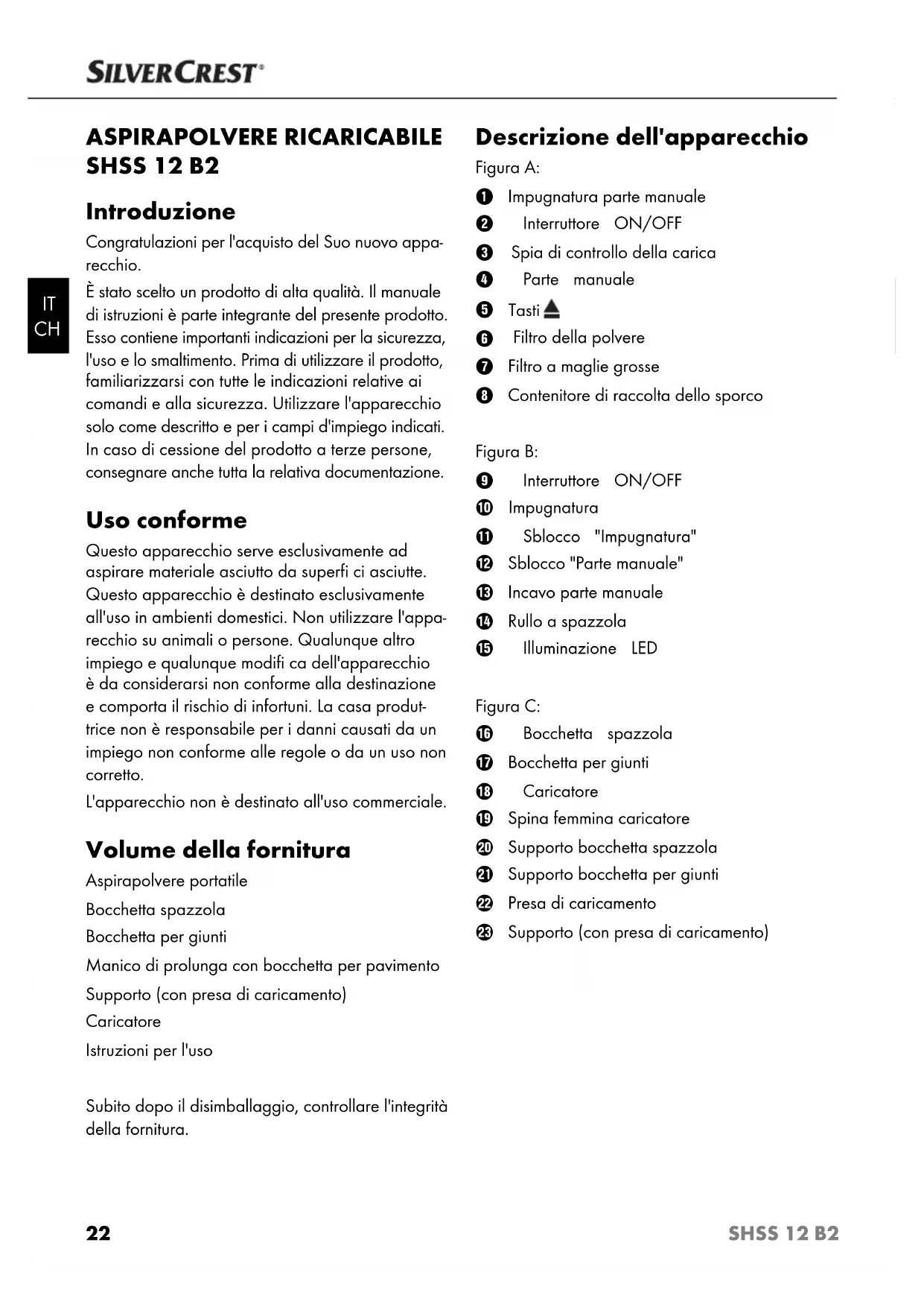 ASPIRAPOLVERE RICARICABILE SHSS 12 B2 Introduzione Congratulazioni per l'acquisto del Suo nuovo appa- recchio. È stato scelto un prodotto di alta qualità. Il manuale di istruzioni è parte integrante del presente prodotto. Esso contiene importanti indicazioni per la sicurezza, l'uso e lo smaltimento. Prima di utilizzare il prodotto, familiarizzarsi con tutte le indicazioni relative ai comandi e alla sicurezza. Utilizzare l'apparecchio solo come descritto e per i campi d'impiego indicati. In caso di cessione del prodotto a terze persone, consegnare anche tutta la relativa documentazione. Uso conforme Questo apparecchio serve esclusivamente ad aspirare materiale asciutto da superfi ci asciutte. Questo apparecchio è destinato esclusivamente all'uso in ambienti domestici. Non utilizzare l'appa- recchio su animali o persone. Qualunque altro impiego e qualunque modifi ca dell'apparecchio è da considerarsi non conforme alla destinazione e comporta il rischio di infortuni. La casa produt- trice non è responsabile per i danni causati da un impiego non conforme alle regole o da un uso non corretto. L'apparecchio non è destinato all'uso commerciale. Volume della fornitura Aspirapolvere portatile Bocchetta spazzola Bocchetta per giunti Manico di prolunga con bocchetta per pavimento Supporto (con presa di caricamento) Caricatore Istruzioni per l'uso Subito dopo il disimballaggio, controllare l'integrità della fornitura. Descrizione dell'apparecchio Figura A: 1 Impugnatura parte manuale 2 Interruttore ON/OFF 3 Spia di controllo della carica 4 Parte manuale