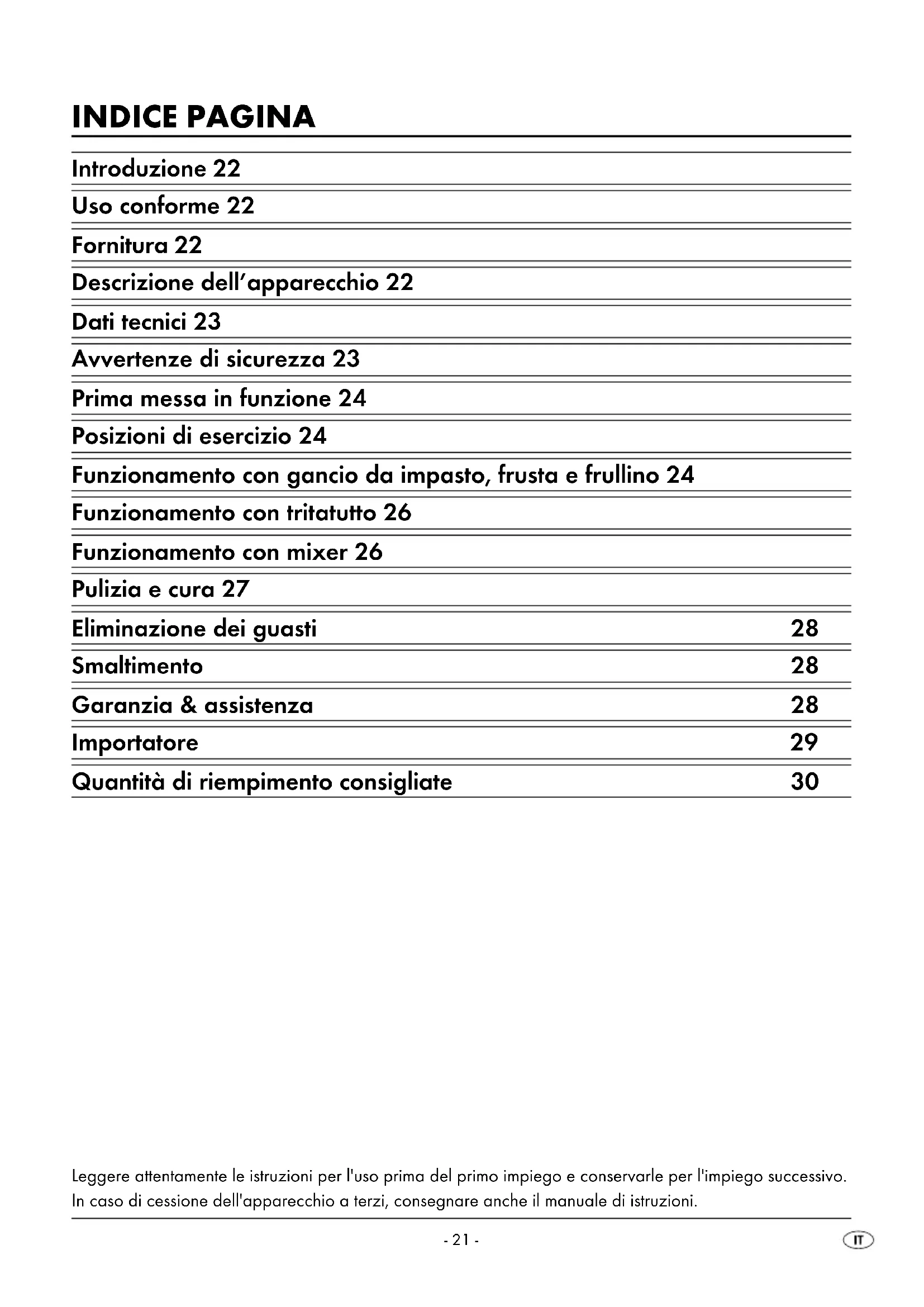 2ème opération de malaxage: 6 minutes 2, 3, 4 Blancs en neige 8 blancs d’œuf 2 3 min 4 Crème chantilly (30% de matières grasses) 600 ml env. 3 min. 4- 21 - INDICE PAGINA Introduzione 22 Uso conforme 22 Fornitura 22 Descrizione dell’apparecchio 22 Dati tecnici 23 Avvertenze di sicurezza 23 Prima messa in funzione 24 Posizioni di esercizio 24 Funzionamento con gancio da impasto, frusta e frullino 24 Funzionamento con tritatutto 26 Funzionamento con mixer 26 Pulizia e cura 27 Eliminazione dei guasti 28 Smaltimento 28 Garanzia & assistenza 28 Importatore 29 Quantità di riempimento consigliate 30 Leggere attentamente le istruzioni per l'uso prima del primo impiego e conservarle per l'impiego successivo. In caso di cessione dell'apparecchio a terzi, consegnare anche il manuale di istruzioni.- 22 -