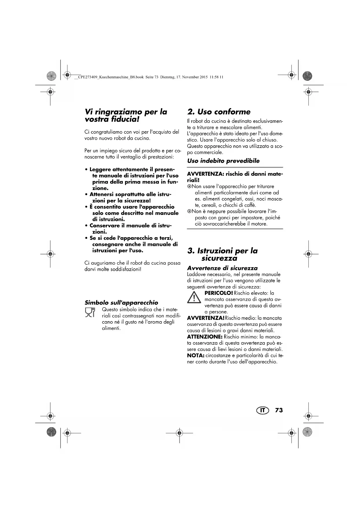 sicurezza Avvertenze di sicurezza Laddove necessario, nel presente manuale di istruzioni per l'uso vengono utilizzate le seguenti avvertenze di sicurezza: PERICOLO! Rischio elevato: la mancata osservanza di questa av- vertenza può essere causa di danni a persone. AVVERTENZA! Rischio medio: la mancata osservanza di questa avvertenza può essere causa di lesioni o gravi danni materiali. ATTENZIONE: Rischio minimo: la manca- ta osservanza di questa avvertenza può es- sere causa di lievi lesioni o danni materiali. NOTA: circostanze e particolarità di cui te- ner conto durante l'uso dell'apparecchio. __CPE273409_Kuechenmaschine_B8.book Seite 73 Dienstag, 17. November 2015 11:58 1174