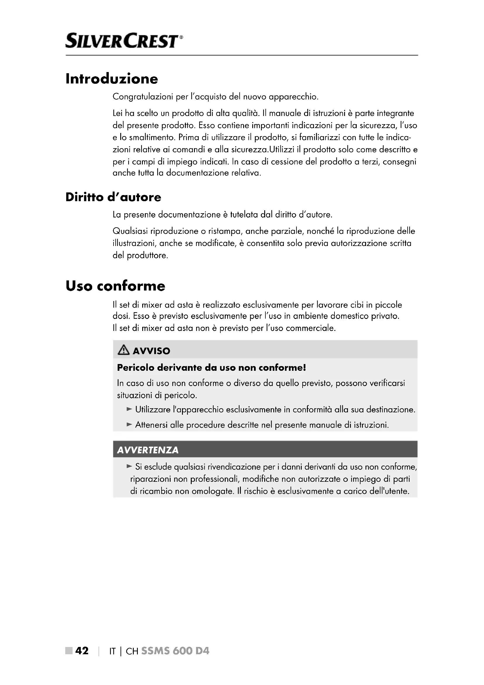 Introduzione Congratulazioni per l’acquisto del nuovo apparecchio. Lei ha scelto un prodotto di alta qualità. Il manuale di istruzioni è parte integrante del presente prodotto. Esso contiene importanti indicazioni per la sicurezza, l’uso e lo smaltimento. Prima di utilizzare il prodotto, si familiarizzi con tutte le indica- zioni relative ai comandi e alla sicurezza.Utilizzi il prodotto solo come descritto e per i campi di impiego indicati. In caso di cessione del prodotto a terzi, consegni anche tutta la documentazione relativa. Diritto d’autore La presente documentazione è tutelata dal diritto d’autore. Qualsiasi riproduzione o ristampa, anche parziale, nonché la riproduzione delle illustrazioni, anche se modificate, è consentita solo previa autorizzazione scritta del produttore. Uso conforme Il set di mixer ad asta è realizzato esclusivamente per lavorare cibi in piccole dosi. Esso è previsto esclusivamente per l’uso in ambiente domestico privato. Il set di mixer ad asta non è previsto per l’uso commerciale. AVVISO Pericolo derivante da uso non conforme! In caso di uso non conforme o diverso da quello previsto, possono verificarsi situazioni di pericolo. ► Utilizzare l'apparecchio esclusivamente in conformità alla sua destinazione. ► Attenersi alle procedure descritte nel presente manuale di istruzioni. AVVERTENZA ► Si esclude qualsiasi rivendicazione per i danni derivanti da uso non conforme, riparazioni non professionali, modifiche non autorizzate o impiego di parti di ricambio non omologate. Il rischio è esclusivamente a carico dell'utente.IT