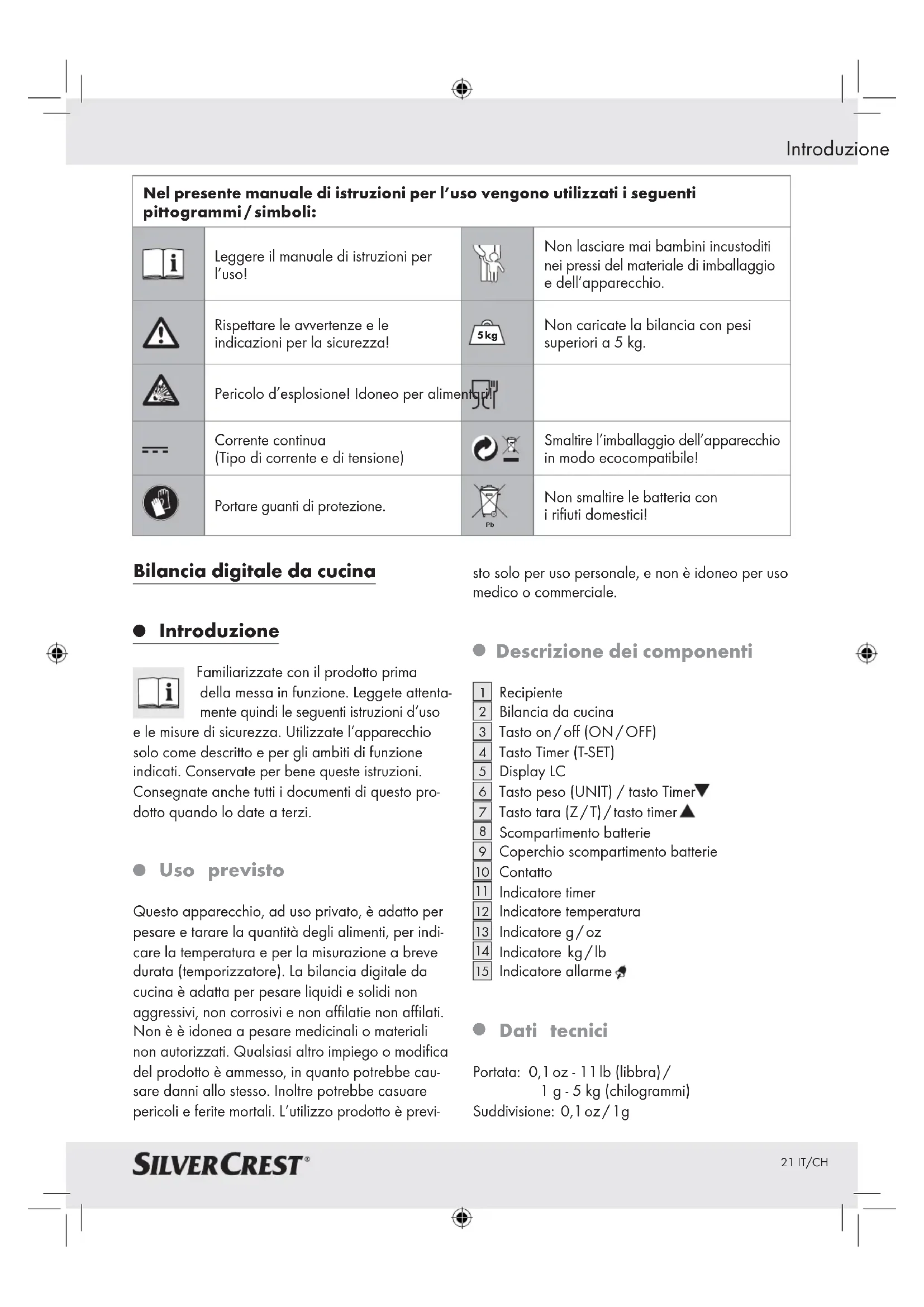 Uso previsto Questo apparecchio, ad uso privato, è adatto per pesare e tarare la quantità degli alimenti, per indi- care la temperatura e per la misurazione a breve durata (temporizzatore). La bilancia digitale da cucina è adatta per pesare liquidi e solidi non aggressivi, non corrosivi e non affilatie non affilati. Non è è idonea a pesare medicinali o materiali non autorizzati. Qualsiasi altro impiego o modifica del prodotto è ammesso, in quanto potrebbe cau- sare danni allo stesso. Inoltre potrebbe casuare pericoli e ferite mortali. L‘utilizzo prodotto è previ- sto solo per uso personale, e non è idoneo per uso medico o commerciale.
