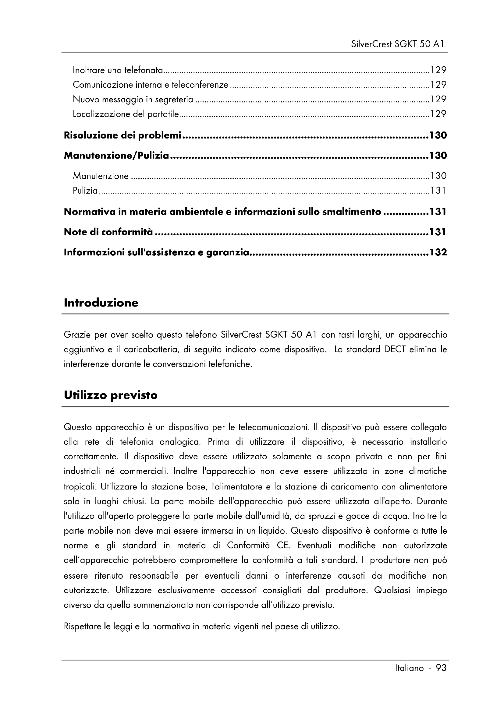 Quando si utilizza la modalità di composizione a impulsi con un PBX, è possibile che si verifichino malfunzionamenti. Ciò perché il PBX non interpreta in modo corretto gli impulsi. Passare alla modalità di composizione a toni. Manutenzione/Pulizia Manutenzione L’assistenza è necessaria quando il dispositivo ha subito danni di qualsiasi tipo, come, per esempio, quando l’esterno appare danneggiato, quando liquidi od oggetti sono penetrati all’interno del dispositivo o quando il prodotto è stato esposto a pioggia o umidità. Inoltre, è necessaria la riparazione in caso di malfunzionamento o caduta del prodotto. In presenza di fumo, rumori od odori insoliti scollegare immediatamente il dispositivo dall’alimentazione di rete. In questo caso, non utilizzare ulteriormente l’apparecchio e farlo controllare da personale autorizzato. Tutte le riparazioni devono essere eseguite da personale specializzato. Non aprire il dispositivo. L’apertura potrebbe provocare scosse elettriche mortali. L’apertura del dispositivo, inoltre, potrebbe danneggiarlo e annullare la garanzia.SilverCrest SGKT 50 A1 Italiano - 131 Pulizia Prima di pulirlo, scollegare l’apparecchio dall’alimentazione di rete per evitare il rischio di scosse elettriche. Per pulire utilizzare un panno asciutto. Non impiegare mai solventi o detergenti che possano danneggiare i materiali plastici. Accertarsi che liquidi non siano penetrati all’interno. In caso di sporco ostinato, utilizzare un panno leggermente inumidito. Normativa in materia ambientale e informazioni sullo smaltimento I dispositivi contrassegnati da questo simbolo sono soggetti alla Direttiva europea 2012/19/EU. Tutti i dispositivi elettrici ed elettronici devono essere smaltiti separatamente dai rifiuti domestici, presso i centri di smaltimento ufficiali. Uno smaltimento adeguato dei dispositivi usati evita danni all’ambiente e alla salute. Per ulteriori informazioni su uno smaltimento appropriato, contattare i locali enti di smaltimento, le autorità competenti o il negozio dove è stato acquistato l’apparecchio. Rispettare l’ambiente. Non smaltire le batterie fra i rifiuti domestici. Portarle in un apposito punto di raccolta. Attenzione! Le batterie devono essere smaltite, totalmente scariche, negli appositi punti di raccolta differenziata. Nel caso in cui si gettino batterie non completamente scariche, prendere le necessarie precauzioni per prevenire cortocircuiti. Smaltire i materiali d’imballaggio in maniera eco-compatibile. I cartoni dell’imballaggio possono essere portati ai cassonetti per la carta o nei punti di raccolta pubblica per essere riciclati. Eventuali pellicole o plastiche contenute nell’imballaggio possono essere portate nei punti di raccolta pubblica. Note di conformità Questo dispositivo è conforme ai requisiti di base e ad altri relativi della direttiva R&TTE 1999/5/EC, della direttiva sulla bassa tensione 2006/95/EC, della direttiva ErP 2009/125/EC e della direttiva RoHS 2011/65/EU. La Dichiarazione di conformità si trova alla fine di questo manuale per l’utente.SilverCrest SGKT 50 A1