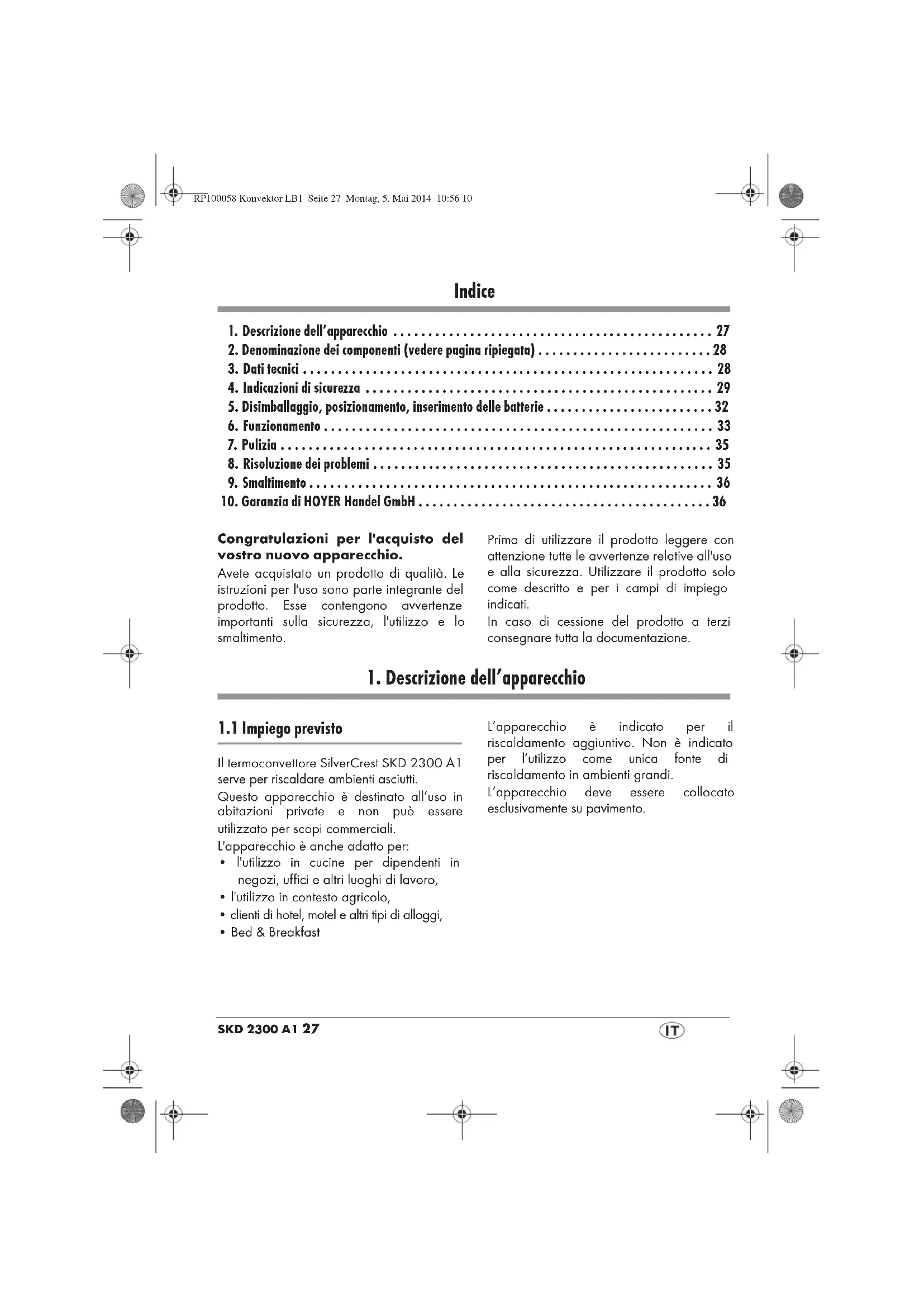 Gentile cliente, questo apparecchio è accompagnato da una garanzia di 3 anni a partire dalla data di acquisto. In caso di difetti del prodotto può far valere i Suoi diritti nei confronti del venditore come previsto dalla legge. Tali diritti di legge non sono limitati dalla nostra garanzia, descritta di seguito in dettaglio. Condizioni di garanzia Il periodo di garanzia ha inizio dalla data di acquisto. Conservare pertanto lo scontrino di cassa originale, in quanto documento comprovante l'acquisto. Se entro tre anni dalla data di acquisto di questo prodotto insorge un difetto di materiale o di fabbricazione, ci impegniamo a riparare o a sostituire a nostra scelta il prodotto. La prestazioni di garanzia presuppone, entro il termine di tre anni, la presentazione dell'apparecchio difettoso e della prova di acquisto (scontrino di cassa) e una breve descrizione scritta del difetto e del momento in cui è insorto. Se il difetto è coperto dalla nostra garanzia, ci impegniamo a rispedire il prodotto riparato o un nuovo prodotto. Con la riparazione o la sostituzione del prodotto non decorre un nuovo periodo di garanzia. RP100058 Konvektor LB1 Seite 36 Montag, 5. Mai 2014 10:56 10SKD2300A1 37 Periodo di garanzia e rivendicazioni per difetti Il periodo di garanzia non viene prolungato dalla prestazione di garanzia. Questo vale anche per le parti sostituite e riparate. Eventuali danni o difetti riscontrati già al momento dell'acquisto devono essere comunicati subito dopo l'apertura della confezione. Dopo lo scadere del periodo di garanzia le riparazioni vengono effettuate a pagamento. Ambito della garanzia L’apparecchio è stato prodotto rispettando i più severi standard di qualità ed è stato scrupolosamente testato prima della spedizione. La garanzia copre i difetti di materiale o di fabbricazione. Non si estende alle parti del prodotto soggette a normale usura e considerate pertanto parti usurabili, né ai danni ai componenti più fragili, ad es. interruttori, batterie o parti in vetro. La garanzia decade se il prodotto viene danneggiato, utilizzato o sottoposto a manutenzione in modo non conforme. Per un utilizzo conforme del prodotto è necessario attenersi a tutte le avvertenze contenute nelle istruzioni per l'uso. Sono assolutamente da evitare gli utilizzi e le azioni che le istruzioni per l'uso sconsigliano. Il prodotto è concepito esclusivamente per l’uso privato, non per quello commerciale. La garanzia decade in caso di utilizzo indebito e non conforme, uso della forza e interventi non effettuati dal nostro centro d'assistenza autorizzato. Svolgimento della garanzia Per garantire una rapida evasione della richiesta del cliente, si consiglia di attenersi alla procedura seguente: