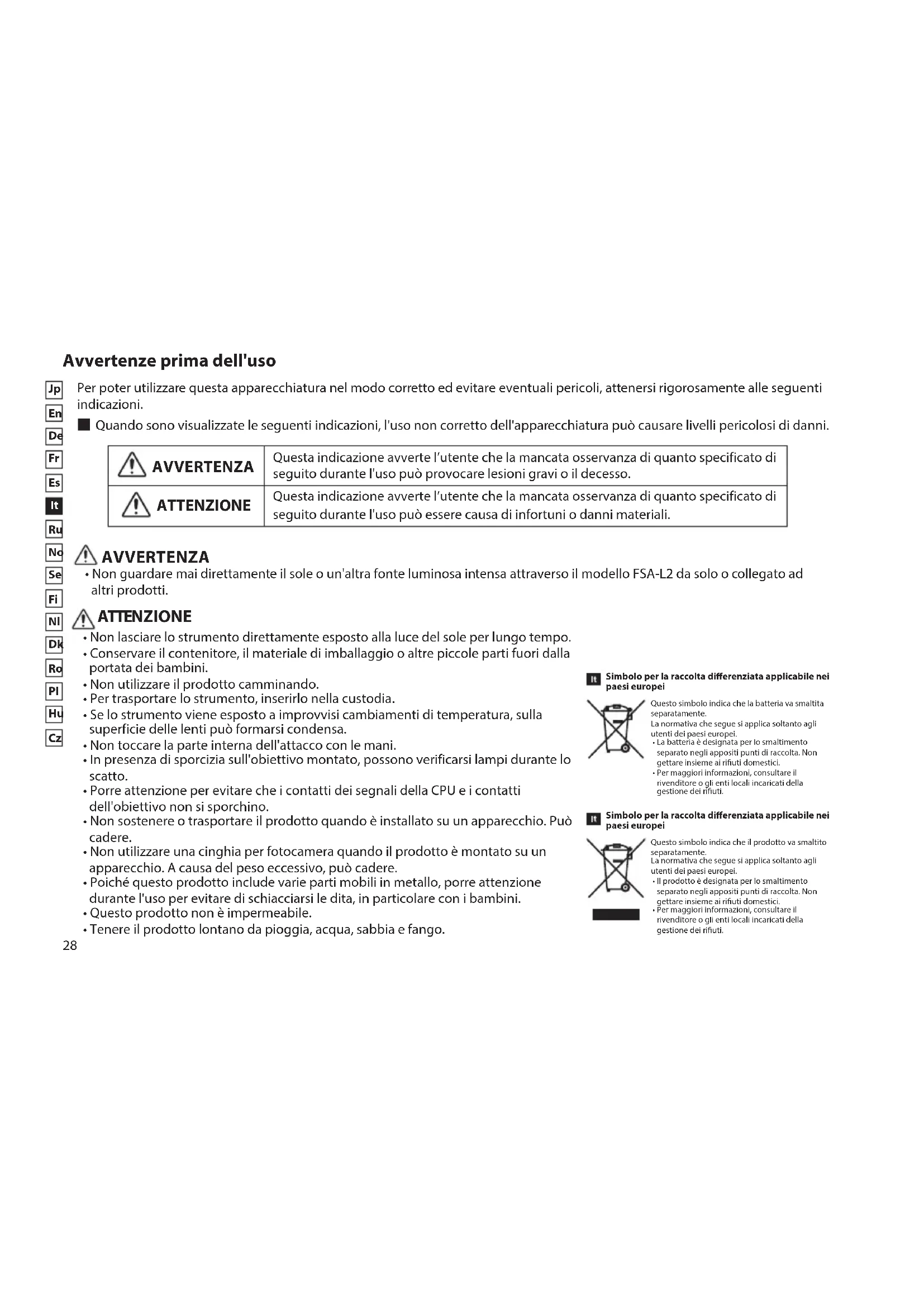 - Non guardare mai direttamente il sole o un'altra fonte luminosa intensa attraverso il modello FSA-L2 da solo o collegato ad altri prodotti. Simbolo per la raccolta dierenziata applicabile nei paesi europeiQuesto simbolo indica che la batteria va smaltita separatamente.La normativa che segue si applica soltanto agli utenti dei paesi europei. • La batteria è designata per Io smaltimento separato negli appositi punti di raccolta. Non gettare insieme ai riuti domestici. • Per maggiori informazioni, consultare il rivenditore o gIi enti locali incaricati della gestione dei riuti.Simbolo per la raccolta dierenziata applicabile nei paesi europeiQuesto simbolo indica che il prodotto va smaltito separatamente.La normativa che segue si applica soltanto agli utenti dei paesi europei. • Il prodotto è designata per Io smaltimento separato negli appositi punti di raccolta. Non gettare insieme ai riuti domestici. • Per maggiori informazioni, consultare il rivenditore o gIi enti locali incaricati della gestione dei riuti.29