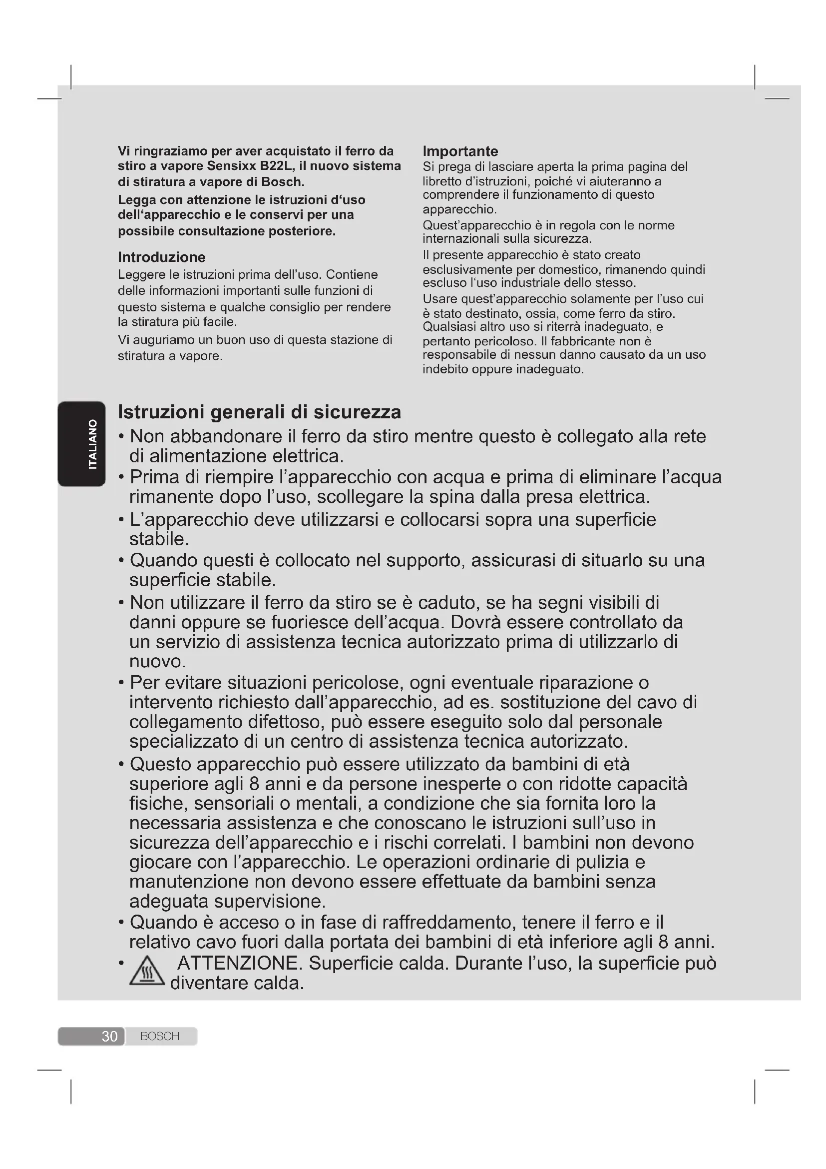 Quest’apparecchio raggiunge altissime temperature e produce vapore durante il suo uso, ciò potrebbe provocare scottature o bruciature in caso di utilizzo non corretto. Durante l’uso, il tubo del vapore, il corpo della caldaia, la piastra in metallo in fondo al poggiaferro rimovibile (2) e, in particolare, il ferro possono diventare caldi.Questo è normale. Non dirigere il vapore a persone o animali. Non permettere che il cavo entri in contatto con la piastra del ferro quando questi è caldo. È possibile che il sistema continui a emettere vapore per un breve periodo di tempo dopo il rilascio della levetta: si tratta di una normale caratteristica del funzionamento.31 B O S C H Si prega di lasciare aperta la prima pagina del libretto d’istruzioni, poiché vi aiuteranno a comprendere il funzionamento di questo apparecchio.Quest’apparecchio è in regola con le norme internazionali sulla sicurezza.Il presente apparecchio è stato creato esclusivamente per domestico, rimanendo quindi escluso l‘uso industriale dello stesso.Usare quest’apparecchio solamente per l’uso cui è stato destinato, ossia, come ferro da stiro. Qualsiasi altro uso si riterrà inadeguato, e pertanto pericoloso. Il fabbricante non è responsabile di nessun danno causato da un uso indebito oppure inadeguato.