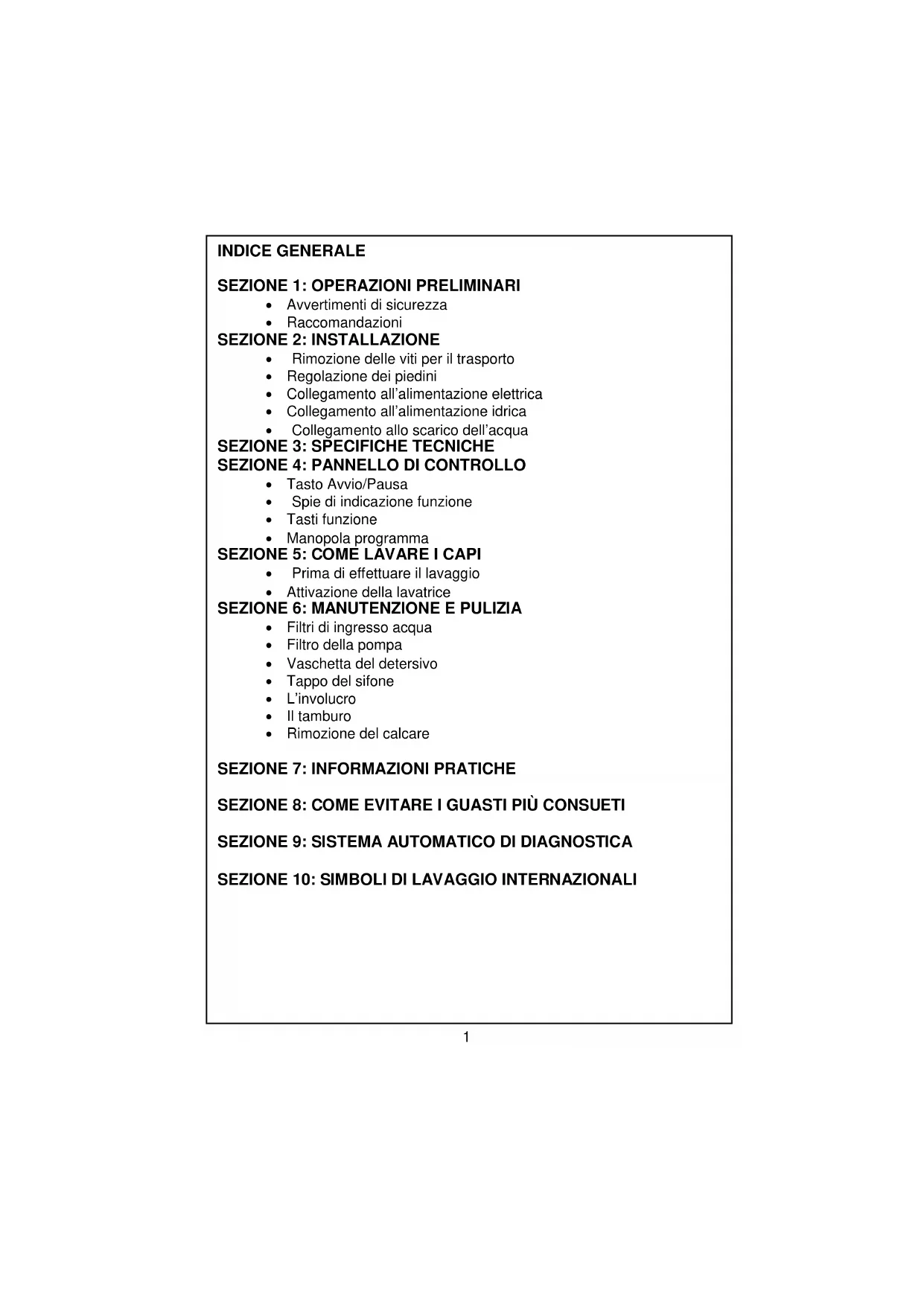 Avvertimenti di sicurezza Raccomandazioni SEZIONE 2: INSTALLAZIONE Rimozione delle viti per il trasporto Regolazione dei piedini Collegamento all’alimentazione elettrica Collegamento all’alimentazione idrica Collegamento allo scarico dell’acqua