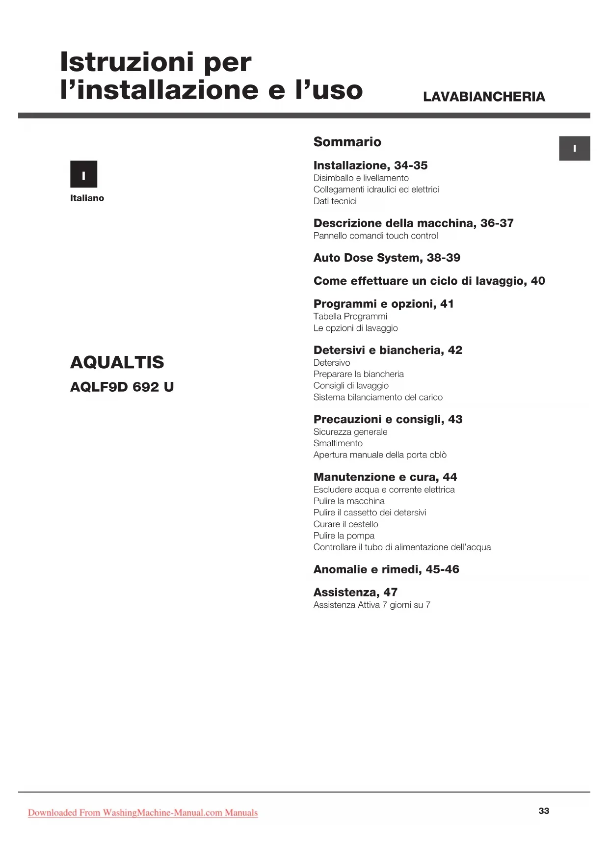 Italiano Sommario Installazione, 34-35 Disimballo e livellamentoCollegamenti idraulici ed elettriciDati tecnici Descrizione della macchina, 36-37 Pannello comandi touch control Auto Dose System, 38-39 Come effettuare un ciclo di lavaggio, 40 Programmi e opzioni, 41 Tabella ProgrammiLe opzioni di lavaggio Detersivi e biancheria, 42 DetersivoPreparare la biancheriaConsigli di lavaggioSistema bilanciamento del carico Precauzioni e consigli, 43 Sicurezza generaleSmaltimentoApertura manuale della porta oblò Manutenzione e cura, 44 Escludere acqua e corrente elettricaPulire la macchinaPulire il cassetto dei detersiviCurare il cestelloPulire la pompaControllare il tubo di alimentazione dell’acqua Anomalie e rimedi, 45-46 Assistenza, 47 Assistenza Attiva 7 giorni su 7