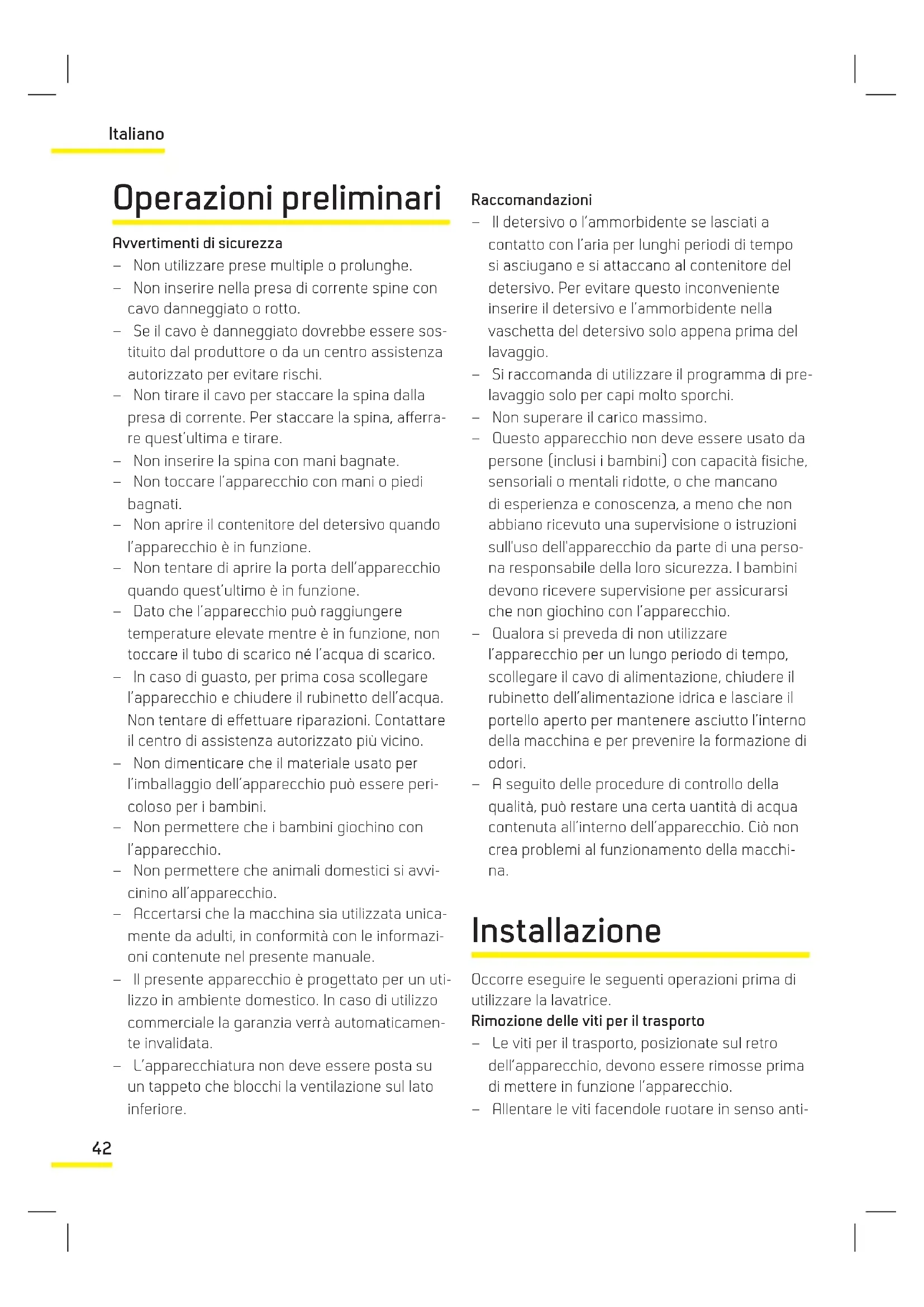 Attenzione Prima di selezionare il programma o di cambiare un programma portare la manopola programma su O (disatt.). Spie di indicazione funzione Quando si preme il tasto avvio/pausa o qualsiasi altro tasto funzione, si accende la spia corris- pondente. La spia si spegne quando si preme di nuovo il tasto funzione o il tasto avvio/pausa, o al completamento del processo selezionato. Le spie di indicazione della funzione servono anche per il sistema di individuazione di eventuali guasti, indicato nella sezione 9. Tasti funzione Mantieni acqua di risciacquatura Si raccomanda di selezionare questa funzione quando non è possibile recuperare gli indumenti subito dopo il termine del programma. Ciò con- sente di evitare la formazione di grinze. Premendo questo tasto, l’ultima acqua di risciacquatura non viene scaricata. Per continuare il programma dallo stesso punto, premere nuovamente il tasto. In caso di capi delicati che non si desidera sotto- porre a centrifuga o che si desidera sottoporre a centrifuga per capi delicati, posizionare la mano- pola su O (disatt.), poi impostare il programma di scarico o di centrifuga desiderato e premere il tasto avvio/pausa. Se il programma selezionato è un programma di scarico, la macchina prov- vederà a scaricare l’acqua rimasta all’interno. Se il programma selezionato è di centrifuga, la macchina eseguirà un’operazione di centrifuga, poi il programma sarà terminato. Stiratura facilitata Questa funzione consente di estrarre capi meno raggrinziti dopo il lavaggio. Ammollo Selezionando questa funzione si garantisce un lavaggio migliore, in quanto i capi vengono lasciati in ammollo in acqua e detersivo per un certo pe- riodo di tempo prima che venga immessa l’acqua iniziale e la macchina inizi il ciclo di lavaggio. Si raccomanda di selezionare questa funzione in caso di capi molto sporchi. Attenzione Le funzioni variano in base al modello acquistato. Se ci si è dimenticati di utilizzare una funzione supplementare e la macchina ha già iniziato il ciclo di lavaggio, premere il tasto funzione supplementare se la spia è accesa. Ciò attiverà la funzione supplementare. Se la spia è spenta non è possibile attivare la funzione supplementare.. Selettore velocità di centrifuga Tramite la manopola di selezione della velocità di centrifuga si può impostare la velocità per il pro- cesso di centrifuga dei capi. L’intervallo di rego- lazione della velocità è compreso tra O (nessuna centrifuga) e la velocità massima di centrifuga della macchina.. Nota Accertarsi che il processo di centrifuga sele- zionato sia adeguato in caso di capi delicati.47 Italiano Manopola programma Con questa manopola programma è possibile selezionare il programma con cui effettuare il la- vaggio dei capi. Si può regolare il processo di se- lezione del programma ruotando la manopola in entrambe le direzioni. È opportuno accertarsi che il segno di regolazione della manopola program- ma sia posizionato esattamente sul programma desiderato. Quando si posiziona la manopola su O (disatt.) e la macchina è in funzione, il programma non viene completato.. Come lavare i capi – Inserire la spina del cavo di alimentazione della macchina. – Aprire il rubinetto per l’immissione dell’acqua. Primo ciclo di lavaggio All’interno della macchina potrebbe esservi dell’acqua residua dai collaudi di fabbrica. Si raccomanda di eseguire il primo ciclo di lavaggio senza biancheria per rimuovere quest’acqua; versare mezzo misurino di detersivo universale nello scomparto 2 e selezionare il programma cotone a 90°C. Prima di effettuare il lavaggio Cernita dei capi da inserire – Selezionare i capi in base alla composizione (cotone, sintetico, delicato, lana, ecc.), alle temperature di lavaggio e al livello di sporco. – Non inserire mai insieme per il lavaggio capi bianchi e colorati. – Dal momento che capi nuovi colorati possono rilasciare colore al primo lavaggio, lavarli sepa- ratamente. – Accertarsi che non vi siano oggetti metallici nelle tasche, nel qual caso toglierli. – Chiudere eventuali zip e abbottonare i capi provvisti di bottoni. – Togliere gli agganci in plastica o in metallo delle tende e i lacci, oppure inserirli in un sacchetto per lavaggio e legarlo. – Girare a rovescio capi come pantaloni, tessuti a uncinetto, t-shirt e tute. – nserire capi piccoli come calze e fazzoletti in un sacchetto per lavaggio. Lavaggio a 90C Lavaggio a 60C Lavaggio a 30C Non lavare in lavatrice Inserimento dei capi nella macchina – Aprire il portello della macchina. – Inserire i capi nella macchina distribuendoli bene all’interno. – Inserire ogni capo separatamente. – Quando si chiude il portello della macchina, accertarsi che non vi siano capi impigliati tra il coperchio e la guarnizione. – Chiudere saldamente il portello della macchina. In caso contrario il ciclo di lavaggio non potrà essere avviato. Inserimento del detersivo nella macchina La quantità di detersivo da inserire dipende dai seguenti criteri: – Il consumo di detersivo dipende dal livello di sporcizia dei capi. Per capi poco sporchi, non eseguire il prelavaggio e inserire una dose piccola di detersivo nello scomparto n. 2 del contenitore del detersivo. – Per capi molto sporchi, selezionare un pro-48 Italiano gramma che preveda il prelavaggio, inserire ¼ della dose di detersivo che si inserirebbe nello scomparto 1 del contenitore del detersivo e la dose restante nello scomparto 2. – Utilizzare per la macchina i detersivi apposi- tamente sviluppati per lavatrici automatiche. Le quantità da utilizzare con i capi sono scritte sulla confezione del detersivo. – Più l’acqua è dura, maggiore è la quantità di detersivo necessaria. – Più capi si inseriscono, maggiore sarà il consu- mo di detersivo. – Inserire l’ammorbidente nello scomparto per ammorbidente che si trova nel contenitore per il detersivo. Non superare il livello indicato dalla scritta MAX. In caso contrario, l’amm