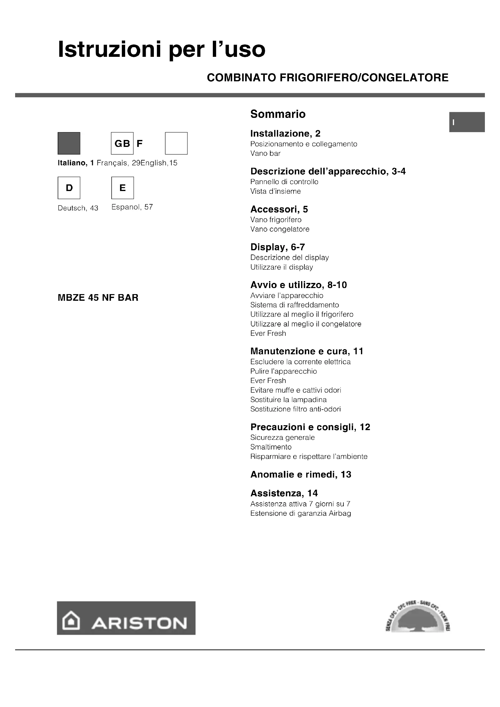 Trova gratuitamente il manuale del dispositivo MBZE45NFBAR Ariston Thermo in formato PDF.