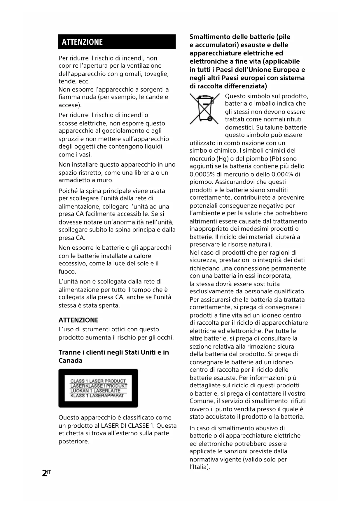 MHC-ECL99BT/MHC-ECL77BT.4-539-415-51(1) ATTENZIONE Per ridurre il rischio di incendi, non coprire l’apertura per la ventilazione dell’apparecchio con giornali, tovaglie, tende, ecc. Non esporre l’apparecchio a sorgenti a fiamma nuda (per esempio, le candele accese). Per ridurre il rischio di incendi o scosse elettriche, non esporre questo apparecchio al gocciolamento o agli spruzzi e non mettere sull’apparecchio degli oggetti che contengono liquidi, come i vasi. Non installare questo apparecchio in uno spazio ristretto, come una libreria o un armadietto a muro. Poiché la spina principale viene usata per scollegare l’unità dalla rete di alimentazione, collegare l’unità ad una presa CA facilmente accessibile. Se si dovesse notare un’anormalità nell’unità, scollegare subito la spina principale dalla presa CA. Non esporre le batterie o gli apparecchi con le batterie installate a calore eccessivo, come la luce del sole e il fuoco. L’unità non è scollegata dalla rete di alimentazione per tutto il tempo che è collegata alla presa CA, anche se l’unità stessa è stata spenta. ATTENZIONE L’uso di strumenti ottici con questo prodotto aumenta il rischio per gli occhi. Tranne i clienti negli Stati Uniti e in Canada Questo apparecchio è classificato come un prodotto al LASER DI CLASSE 1. Questa etichetta si trova all’esterno sulla parte posteriore. Smaltimento delle batterie (pile e accumulatori) esauste e delle apparecchiature elettriche ed elettroniche a fine vita (applicabile in tutti i Paesi dell’Unione Europea e negli altri Paesi europei con sistema di raccolta differenziata) Questo simbolo sul prodotto, batteria o imballo indica che gli stessi non devono essere trattati come normali rifiuti domestici. Su talune batterie questo simbolo può essere utilizzato in combinazione con un simbolo chimico. I simboli chimici del mercurio (Hg) o del piombo (Pb) sono aggiunti se la batteria contiene più dello 0.0005% di mercurio o dello 0.004% di piombo. Assicurandovi che questi prodotti e le batterie siano smaltiti correttamente, contribuirete a prevenire potenziali conseguenze negative per l’ambiente e per la salute che potrebbero altrimenti essere causate dal trattamento inappropriato dei medesimi prodotti o batterie. Il riciclo dei materiali aiuterà a preservare le risorse naturali. Nel caso di prodotti che per ragioni di sicurezza, prestazioni o integrità dei dati richiedano una connessione permanente con una batteria in essi incorporata, la stessa dovrà essere sostituita esclusivamente da personale qualificato. Per assicurarsi che la batteria sia trattata correttamente, si prega di consegnare i prodotti a fine vita ad un idoneo centro di raccolta per il riciclo di apparecchiature elettriche ed elettroniche. Per tutte le altre batterie, si prega di consultare la sezione relativa alla rimozione sicura della batteria dal prodotto. Si prega di consegnare le batterie ad un idoneo centro di raccolta per il riciclo delle batterie esauste. Per informazioni più dettagliate sul riciclo di questi prodotti o batterie, si prega di contattare il vostro Comune, il servizio di smaltimento rifiuti ovvero il punto vendita presso il quale è stato acquistato il prodotto o la batteria. In caso di smaltimento abusivo di batterie o di apparecchiature elettriche ed elettroniche potrebbero essere applicate le sanzioni previste dalla normativa vigente (valido solo per l’Italia).3