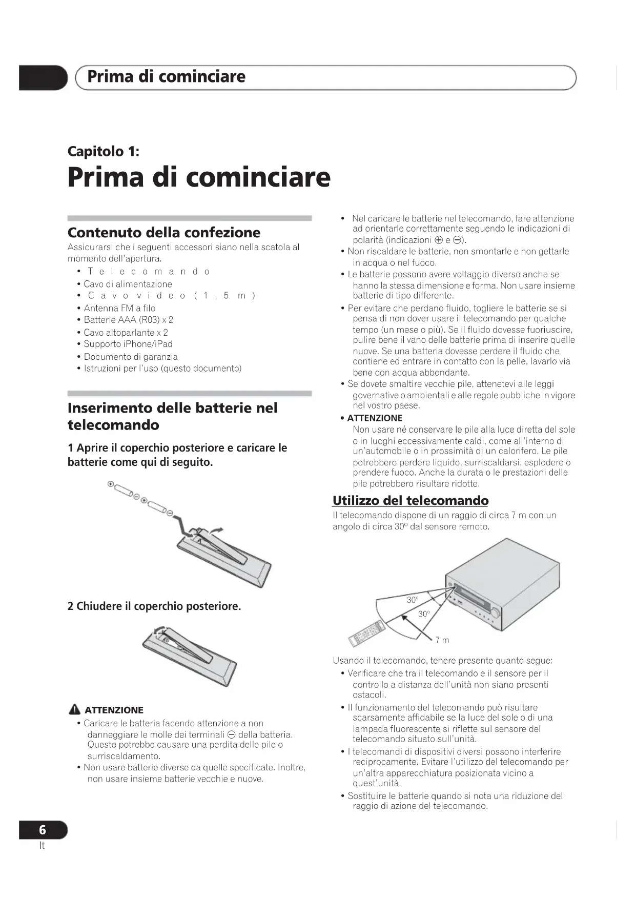 Capitolo 1: Prima di cominciare Contenuto della confezione Assicurarsi che i seguenti accessori siano nella scatola al momento dell’apertura.•Telecomando• Cavo di alimentazione•Cavo video (1,5 m)• Antenna FM a filo• Batterie AAA (R03) x 2• Cavo altoparlante x 2• Supporto iPhone/iPad• Documento di garanzia• Istruzioni per l’uso (questo documento) Inserimento delle batterie nel telecomando 1 Aprire il coperchio posteriore e caricare le batterie come qui di seguito. 2 Chiudere il coperchio posteriore. ATTENZIONE• Caricare le batteria facendo attenzione a non danneggiare le molle dei terminali della batteria. Questo potrebbe causare una perdita delle pile o surriscaldamento.• Non usare batterie diverse da quelle specificate. Inoltre, non usare insieme batterie vecchie e nuove.