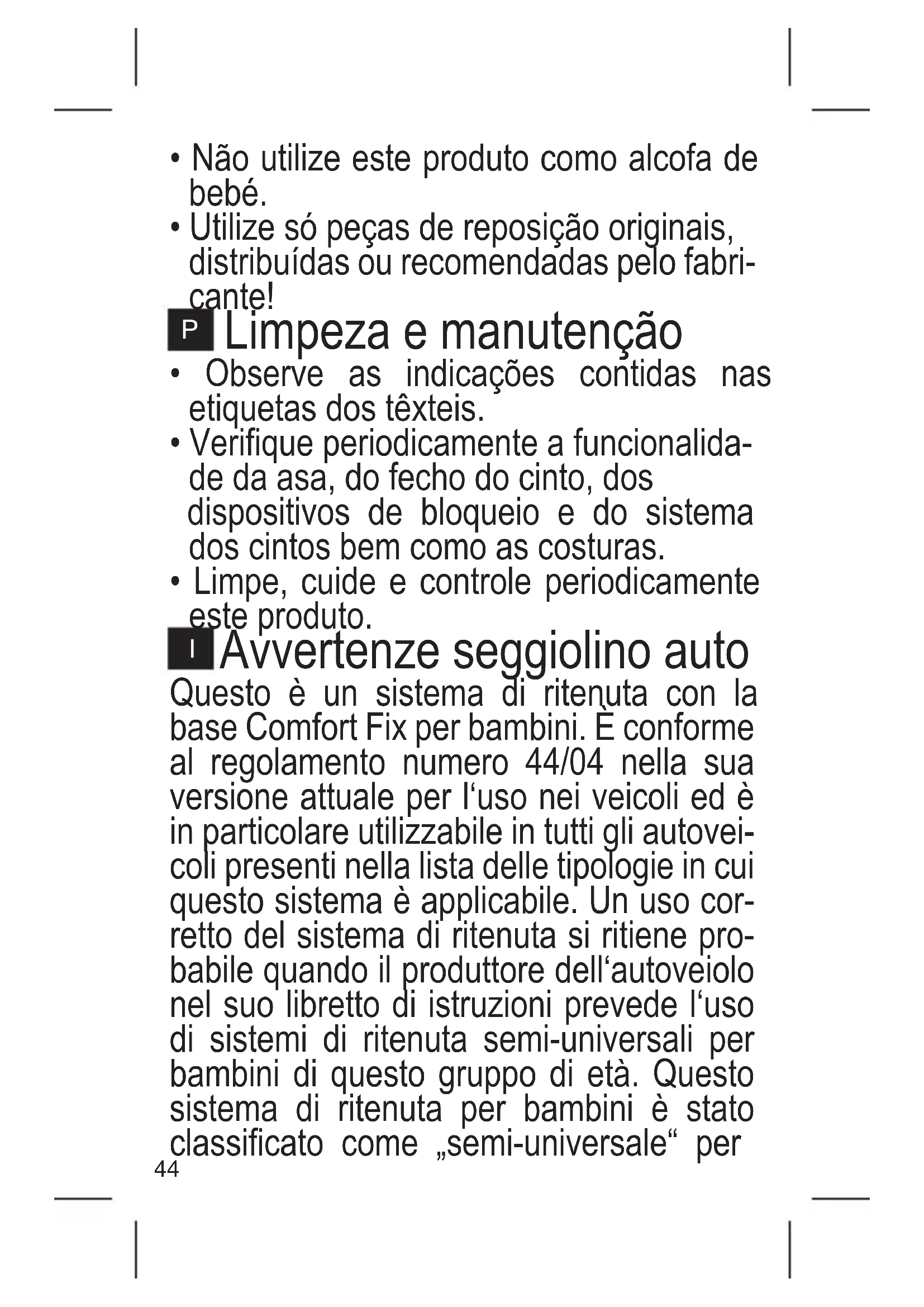 Avvertenze seggiolino auto Questo è un sistema di ritenuta con la base Comfort Fix per bambini. È conforme al regolamento numero 44/04 nella sua versione attuale per l‘uso nei veicoli ed è in particolare utilizzabile in tutti gli autovei- coli presenti nella lista delle tipologie in cui questo sistema è applicabile. Un uso cor- retto del sistema di ritenuta si ritiene pro- babile quando il produttore dell‘autoveiolo nel suo libretto di istruzioni prevede l‘uso di sistemi di ritenuta semi-universali per bambini di questo gruppo di età. Questo sistema di ritenuta per bambini è stato classicato come „semi-universale“ per45 questo gruppo di età in base a regole più severe di quelle che venivano applicate ai sistemi che non riportano questa precisa- zione. Il sistema di ritenuta per bambini può essere utilizzato in autveicoli senza base con cintura arrotolabile a 3 punti i quali siano stati approvati dall‘ECE R16 o da altri standard equiparabili.