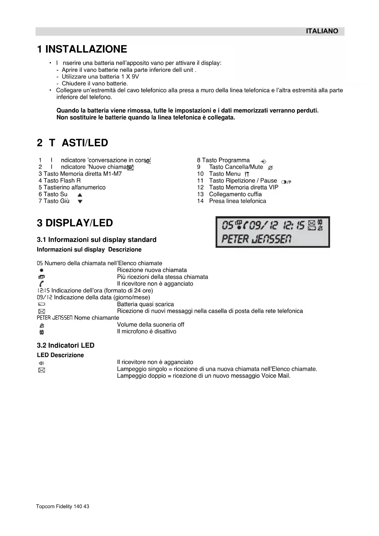 - Collegare un’estremità del cavo telefonico alla presa a muro della linea telefonica e l’altra estremità alla parte inferiore del telefono. Quando la batteria viene rimossa, tutte le impostazioni e i dati memorizzati verranno perduti. Non sostituire le batterie quando la linea telefonica è collegata. 2TASTI/LED 3 DISPLAY/LED