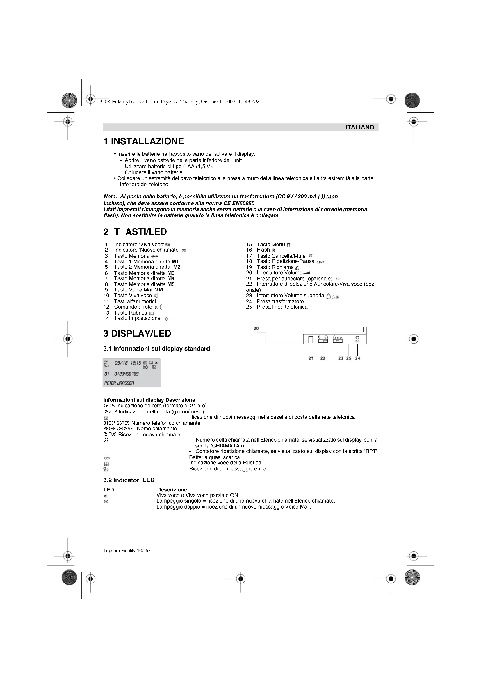 LED Descrizione Viva voce o Viva voce parziale ON Lampeggio singolo = ricezione di una nuova chiamata nell’Elenco chiamate. Lampeggio doppio = ricezione di un nuovo messaggio Voice Mail. 1 Indicatore ’Viva voce’ 2 Indicatore ’Nuove chiamate’ 3 Tasto Memoria 4 Tasto 1 Memoria diretta M1 5 Tasto 2 Memoria diretta M2 6 Tasto Memoria diretta M3 7 Tasto Memoria diretta M4 8 Tasto Memoria diretta M5 9 Tasto Voice Mail VM 10 Tasto Viva voce 11 Tasti alfanumerici 12 Comando a rotella 13 Tasto Rubrica 14 Tasto Impostazione 15 Tasto Menu 16 Flash 17 Tasto Cancella/Mute 18 Tasto Ripetizione/Pausa 19 Tasto Richiama 20 Interruttore Volume 21 Presa per auricolare (opzionale) 22 Interruttore di selezione Auricolare/Viva voce (opzi- onale) 23 Interruttore Volume suoneria 24 Presa trasformatore 25 Presa linea telefonica 9508-Fidelity160_v2 IT.fm Page 57 Tuesday, October 1, 2002 10:43 AM58 Topcom Fidelity 160 ITALIANO 4 FUNZIONAMENTO