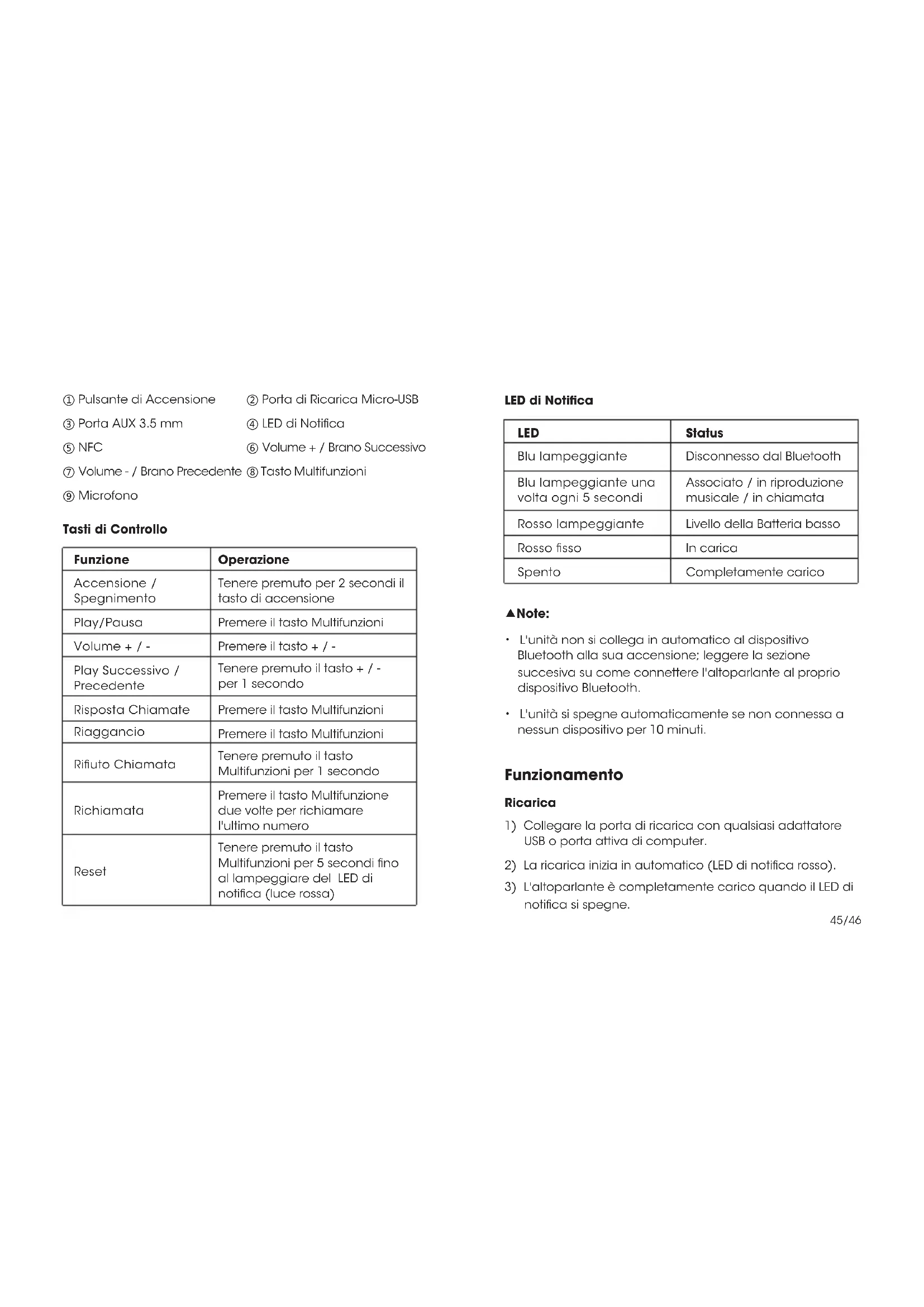 notica si spegne. Tasti di Controllo Funzione Accensione / Spegnimento Play/Pausa Volume + / - Play Successivo / Precedente Risposta Chiamate Riaggancio Riuto Chiamata Richiamata Reset Operazione Tenere premuto per 2 secondi il tasto di accensione Premere il tasto Multifunzioni Premere il tasto + / - Tenere premuto il tasto + / - per 1 secondo Premere il tasto Multifunzioni Premere il tasto Multifunzioni Tenere premuto il tasto Multifunzioni per 1 secondo Premere il tasto Multifunzione due volte per richiamare l'ultimo numero Tenere premuto il tasto Multifunzioni per 5 secondi no al lampeggiare del LED di notica (luce rossa) ① Pulsante di Accensione ③ Porta AUX 3.5 mm ⑤ NFC ⑦ Volume - / Brano Precedente ⑨ Microfono ② Porta di Ricarica Micro-USB ④ LED di Notica ⑥ Volume + / Brano Successivo ⑧ Tasto Multifunzioni LED di Notica LED Blu lampeggiante Blu lampeggiante una volta ogni 5 secondi Rosso lampeggiante Rosso sso Spento Status Disconnesso dal Bluetooth Associato / in riproduzione musicale / in chiamata Livello della Batteria basso In carica Completamente carico ▲Note: