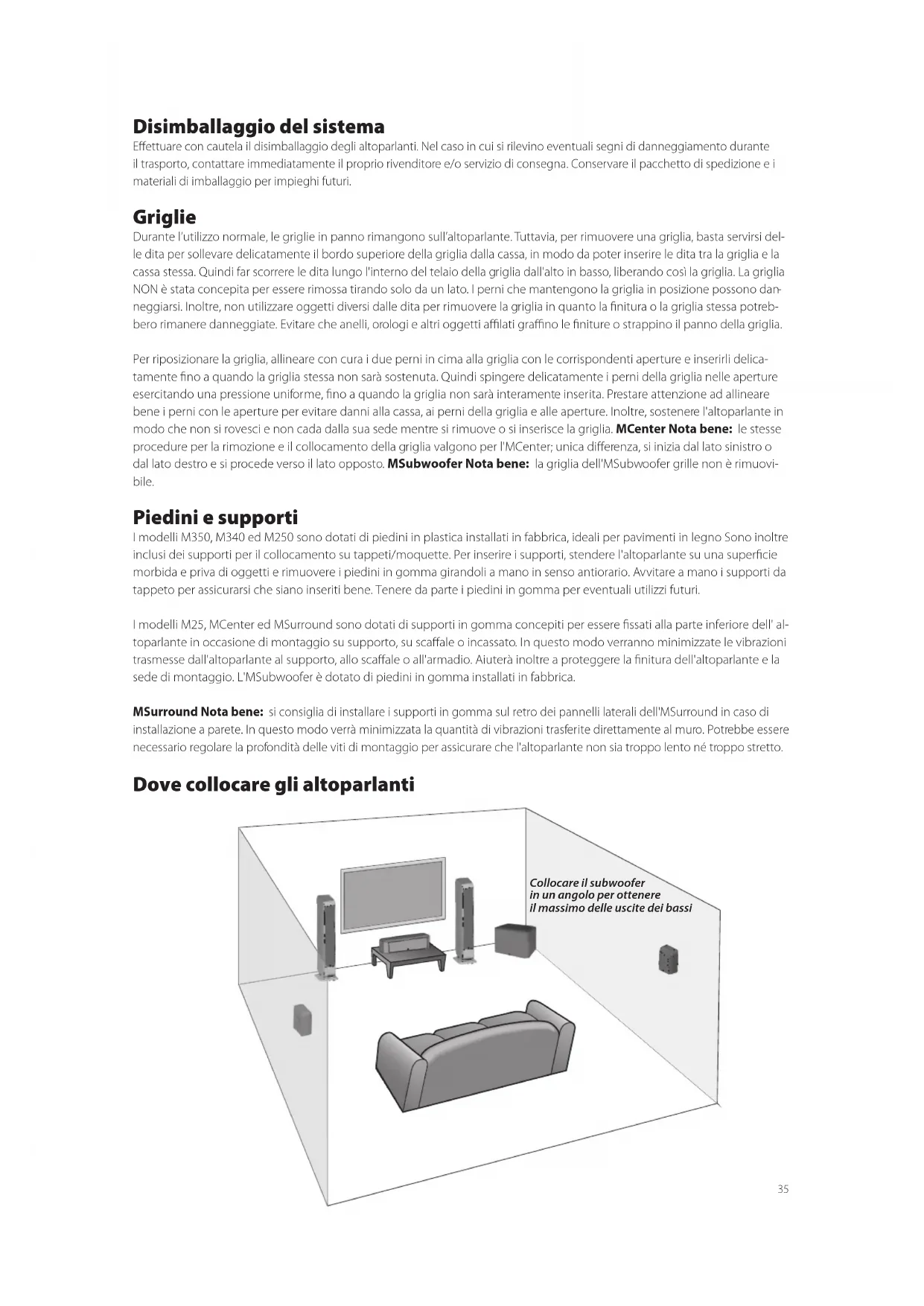 neggiarsi. Inoltre, non utilizzare oggetti diversi dalle dita per rimuovere la griglia in quanto la finitura o la griglia stessa potreb- bero rimanere danneggiate. Evitare che anelli, orologi e altri oggetti affilati graffino le finiture o strappino il panno della griglia. Per riposizionare la griglia, allineare con cura i due perni in cima alla griglia con le corrispondenti aperture e inserirli delica- tamente fino a quando la griglia stessa non sarà sostenuta. Quindi spingere delicatamente i perni della griglia nelle aperture esercitando una pressione uniforme, fino a quando la griglia non sarà interamente inserita. Prestare attenzione ad allineare bene i perni con le aperture per evitare danni alla cassa, ai perni della griglia e alle aperture. Inoltre, sostenere l'altoparlante in modo che non si rovesci e non cada dalla sua sede mentre si rimuove o si inserisce la griglia. MCenter Nota bene: le stesse procedure per la rimozione e il collocamento della griglia valgono per l'MCenter; unica differenza, si inizia dal lato sinistro o dal lato destro e si procede verso il lato opposto. MSubwoofer Nota bene: la griglia dell'MSubwoofer grille non è rimuovi- bile. Piedini e supporti I modelli M350, M340 ed M250 sono dotati di piedini in plastica installati in fabbrica, ideali per pavimenti in legno Sono inoltre inclusi dei supporti per il collocamento su tappeti/moquette. Per inserire i supporti, stendere l'altoparlante su una superficie morbida e priva di oggetti e rimuovere i piedini in gomma girandoli a mano in senso antiorario. Avvitare a mano i supporti da tappeto per assicurarsi che siano inseriti bene. Tenere da parte i piedini in gomma per eventuali utilizzi futuri. I modelli M25, MCenter ed MSurround sono dotati di supporti in gomma concepiti per essere fissati alla parte inferiore dell' al- toparlante in occasione di montaggio su supporto, su scaffale o incassato. In questo modo verranno minimizzate le vibrazioni trasmesse dall'altoparlante al supporto, allo scaffale o all'armadio. Aiuterà inoltre a proteggere la finitura dell'altoparlante e la sede di montaggio. L'MSubwoofer è dotato di piedini in gomma installati in fabbrica. MSurround Nota bene: si consiglia di installare i supporti in gomma sul retro dei pannelli laterali dell'MSurround in caso di installazione a parete. In questo modo verrà minimizzata la quantità di vibrazioni trasferite direttamente al muro. Potrebbe essere necessario regolare la profondità delle viti di montaggio per assicurare che l'altoparlante non sia troppo lento né troppo stretto. Dove collocare gli altoparlanti36 Altoparlanti anteriori sinistro e destro Per ottenere risultati ottimali, si consiglia di iniziare con gli altoparlanti anteriori sinistro e destro, posizionati a 2-4 m di distanza l'uno dall'altro, ad almeno 76 mm di distanza dalla parete o dalle tende alle loro spalle e ad almeno 0,6 m di distanza dagli angoli della stanza. La collocazione degli altoparlanti anteriori sinistro e destro troppo vicini a una parete o a un angolo può causare un rinforzo dei bassi innaturale e riflessi sulle pareti laterali che possono ridurre il suono bilanciato e incolore degli altoparlanti. Se la vostra posizione di ascolto è inferiore alla distanza effettiva tra i due altoparlanti, è preferibile dirigere la parte anteriore degli altoparlanti all'interno verso la posizione di ascolto principale (“toe-in”). La sperimentazione è alla base del ritrovamento della migliore posizione degli altoparlanti sinistro e destro. Suonare un brano di musica stereo che si conosce bene e che presenta una vasta gamma di frequenze è spesso il modo più semplice per trovare la migliore collocazione degli altoparlanti nella stanza in base alle proprie preferenze di ascolto. Altoparlante centrale Per risultati ottimali, si consiglia di collocare l'altoparlante centrale direttamente sotto, dietro (per i soli schermi perforati) o al di sopra del centro dello schermo. Il driver BMR presenta caratteristiche di dispersione estremamente ampie; non è dunque necessario "puntare" il dispersore dell'altoparlante centrale verso la posizione di ascolto. Se collocato su un ripiano o in un armadio, collocare l'altoparlante in modo tale che la parte anteriore sia in linea con il bordo del ripiano o dell'armadio stesso. In questo modo si eviterà che il suono si rifletta in modo da ridurre il suono equilibrato e incolore. Altoparlanti surround Per ottenere risultati ottimali, si consiglia di posizionare gli altoparlanti surround direttamente a lato della posizione di ascolto, al di sopra del livello dell'orecchio e ad almeno 0,6 m dagli angoli della stanza. Se gli altoparlanti sono installati a più di 76 mm dal soffitto, si consiglia di posizionare l'altoparlante in modo tale che le due porte siano rivolte verso il soffitto. Se gli altoparlanti sono installati a meno di 76 mm dal soffitto, si consiglia di posizionare l'altoparlante in modo tale che le due porte siano rivolte verso il pavimento. A livello della parte posteriore del MSurround sono presenti due dispositivi a 4 vie per il montaggio a parete dell'altoparlante in posizione verticale od orizzontale, con le porte rivolte in una direzione o nell'altra. Si consiglia di installare i supporti in gomma sul retro dei pannelli laterali dell'MSurround in caso di installazione a parete. In questo modo verrà minimizzata la quantità di vibrazioni trasferite direttamente al muro. Consultare un esperto affinché consigli, in base al tipo di parete, i dispo- sitivi più adatti per appendere la cassa. Solitamente è meglio lasciare la barra audio staccata dalla parete fino a quando non sono stati stabiliti tutti i collegamenti. Connessioni Dopo aver debitamente collocato gli altoparlanti, è possibile cablare l'impianto. Collegamenti degli altoparlanti Prima di connettere gli altoparlanti, spegnere tutti i componenti dell'impianto. Gli altoparlanti Serie M sono dotati di binding post a 5 vie placcati oro. Possono accogliere fili esp