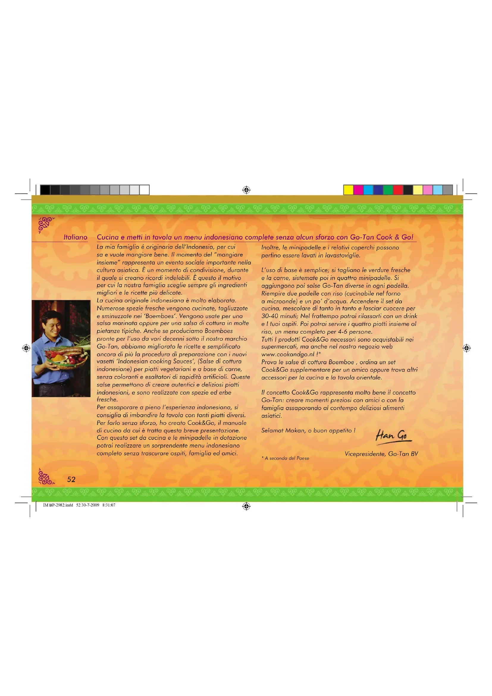 IM BP-2982.indd 51 30-7-2009 8:31:0652 La mia famiglia é originaria dell’Indonesia, per cui sa e vuole mangiare bene. Il momento del “mangiare insieme” rappresenta un evento sociale importante nella cultura asiatica. È un momento di condivisione, durante il quale si creano ricordi indelebili. È questo il motivo per cui la nostra famiglia sceglie sempre gli ingredienti migliori e le ricette più delicate. La cucina originale indonesiana è molto elaborata. Numerose spezie fresche vengono cucinate, tagliuzzate e sminuzzate nei ‘Boemboes’. Vengono usate per una salsa marinata oppure per una salsa di cottura in molte pietanze tipiche. Anche se produciamo Boemboes pronte per l’uso da vari decenni sotto il nostro marchio Go-Tan, abbiamo migliorato le ricette e semplificato ancora di più la procedura di preparazione con i nuovi vasetti ‘Indonesian cooking Sauces’, (Salse di cottura indonesiane) per piatti vegetariani e a base di carne, senza coloranti e esaltatori di sapidità artificiali. Queste salse permettono di creare autentici e deliziosi piatti indonesiani, e sono realizzate con spezie ed erbe fresche. Per assaporare a pieno l’esperienza indonesiana, si consiglia di imbandire la tavola con tanti piatti diversi. Per farlo senza sforzo, ho creato Cook&Go, il manuale di cucina da cui è tratta questa breve presentazione. Con questo set da cucina e le minipadelle in dotazione potrai realizzare un sorprendente menu indonesiano completo senza trascurare ospiti, famiglia ed amici. Inoltre, le minipadelle e i relativi coperchi possono perfino essere lavati in lavastoviglie. L’uso di base è semplice; si tagliano le verdure fresche e la carne, sistemate poi in quattro minipadelle. Si aggiungono poi salse Go-Tan diverse in ogni padella. Riempire due padelle con riso (cucinabile nel forno a microonde) e un po’ d’acqua. Accendere il set da cucina, mescolare di tanto in tanto e lasciar cuocere per 30-40 minuti; Nel frattempo potrai rilassarti con un drink e I tuoi ospiti. Poi potrai servire i quattro piatti insieme al riso, un menu completo per 4-6 persone. Tutti I prodotti Cook&Go necessari sono acquistabili nei supermercati, ma anche nel nostro negozio web www.cookandgo.nl !* Prova le salse di cottura Boemboe , ordina un set Cook&Go supplementare per un amico oppure trova altri accessori per la cucina e la tavola orientale. Il concetto Cook&Go rappresenta molto bene il concetto Go-Tan: creare momenti preziosi con amici o con la famiglia assaporando al contempo deliziosi alimenti asiatici. Selamat Makan, o buon appetito ! Vicepresidente, Go-Tan BV