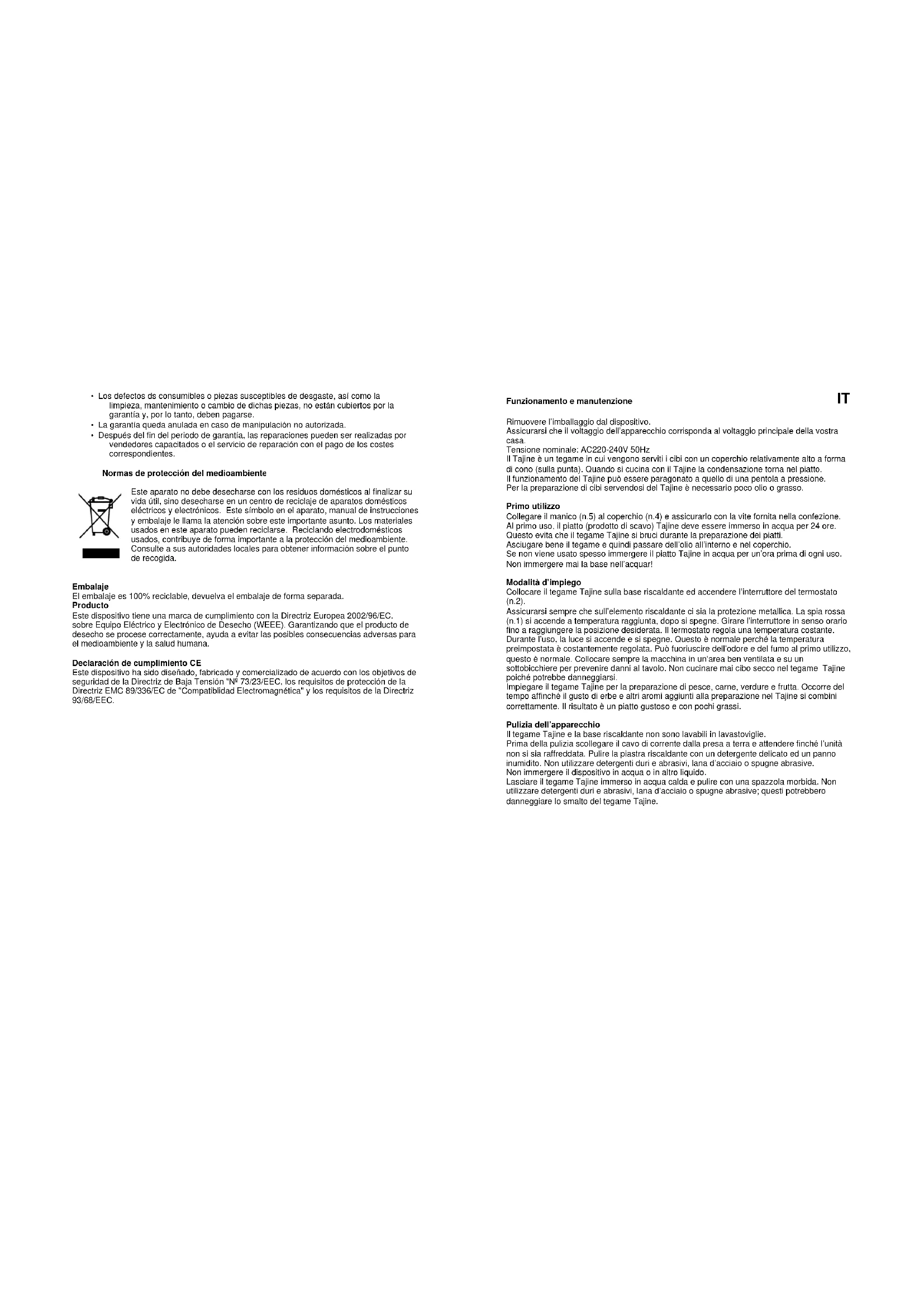 Rimuovere l’imballaggio dal dispositivo. Assicurarsi che il voltaggio dell’apparecchio corrisponda al voltaggio principale della vostra casa. Tensione nominale: AC220-240V 50Hz Il Tajine è un tegame in cui vengono serviti i cibi con un coperchio relativamente alto a forma di cono (sulla punta). Quando si cucina con il Tajine la condensazione torna nel piatto. Il funzionamento del Tajine può essere paragonato a quello di una pentola a pressione. Per la preparazione di cibi servendosi del Tajine è necessario poco olio o grasso. Primo utilizzo Collegare il manico (n.5) al coperchio (n.4) e assicurarlo con la vite fornita nella confezione. Al primo uso, il piatto (prodotto di scavo) Tajine deve essere immerso in acqua per 24 ore. Questo evita che il tegame Tajine si bruci durante la preparazione dei piatti. Asciugare bene il tegame e quindi passare dell’olio all’interno e nel coperchio. Se non viene usato spesso immergere il piatto Tajine in acqua per un’ora prima di ogni uso. Non immergere mai la base nell’acquar! Modalità d’impiego Collocare il tegame Tajine sulla base riscaldante ed accendere l’interruttore del termostato (n.2). Assicurarsi sempre che sull’elemento riscaldante ci sia la protezione metallica. La spia rossa (n.1) si accende a temperatura raggiunta, dopo si spegne. Girare l’interruttore in senso orario fino a raggiungere la posizione desiderata. Il termostato regola una temperatura costante. Durante l’uso, la luce si accende e si spegne. Questo è normale perché la temperatura preimpostata è costantemente regolata. Può fuoriuscire dell’odore e del fumo al primo utilizzo, questo è normale. Collocare sempre la macchina in un’area ben ventilata e su un sottobicchiere per prevenire danni al tavolo. Non cucinare mai cibo secco nel tegame Tajine poiché potrebbe danneggiarsi. Impiegare il tegame Tajine per la preparazione di pesce, carne, verdure e frutta. Occorre del tempo affinché il gusto di erbe e altri aromi aggiunti alla preparazione nel Tajine si combini correttamente. Il risultato è un piatto gustoso e con pochi grassi. Pulizia dell’apparecchio Il tegame Tajine e la base riscaldante non sono lavabili in lavastoviglie. Prima della pulizia scollegare il cavo di corrente dalla presa a terra e attendere finché l’unità non si sia raffreddata. Pulire la piastra riscaldante con un detergente delicato ed un panno inumidito. Non utilizzare detergenti duri e abrasivi, lana d’acciaio o spugne abrasive. Non immergere il dispositivo in acqua o in altro liquido. Lasciare il tegame Tajine immerso in acqua calda e pulire con una spazzola morbida. Non utilizzare detergenti duri e abrasivi, lana d’acciaio o spugne abrasive; questi potrebbero danneggiare lo smalto del tegame Tajine.PRECAUZIONI IMPORTANTI