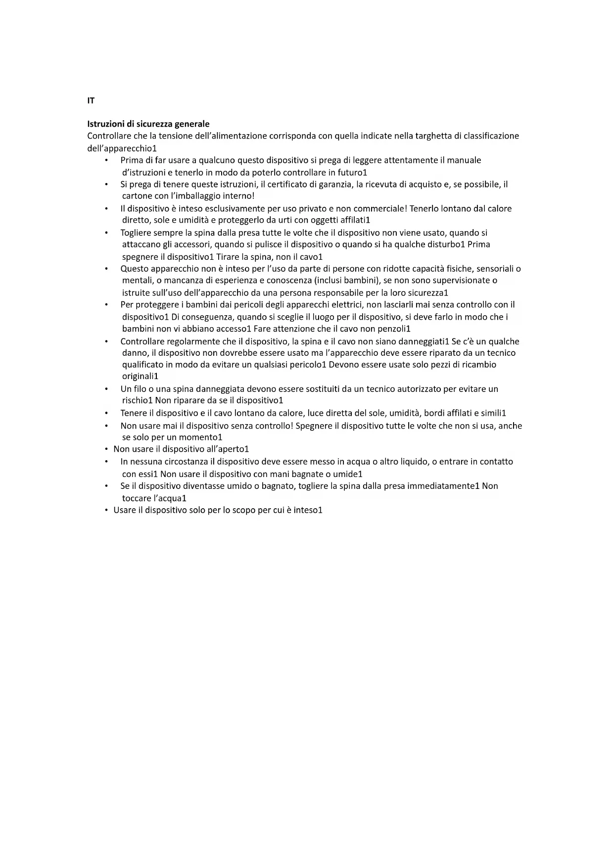 - Questo apparecchio non è inteso per l’uso da parte di persone con ridotte capacità fisiche, sensoriali o mentali, o mancanza di esperienza e conoscenza (inclusi bambini), se non sono supervisionate o istruite sull’uso dell’apparecchio da una persona responsabile per la loro sicurezza.