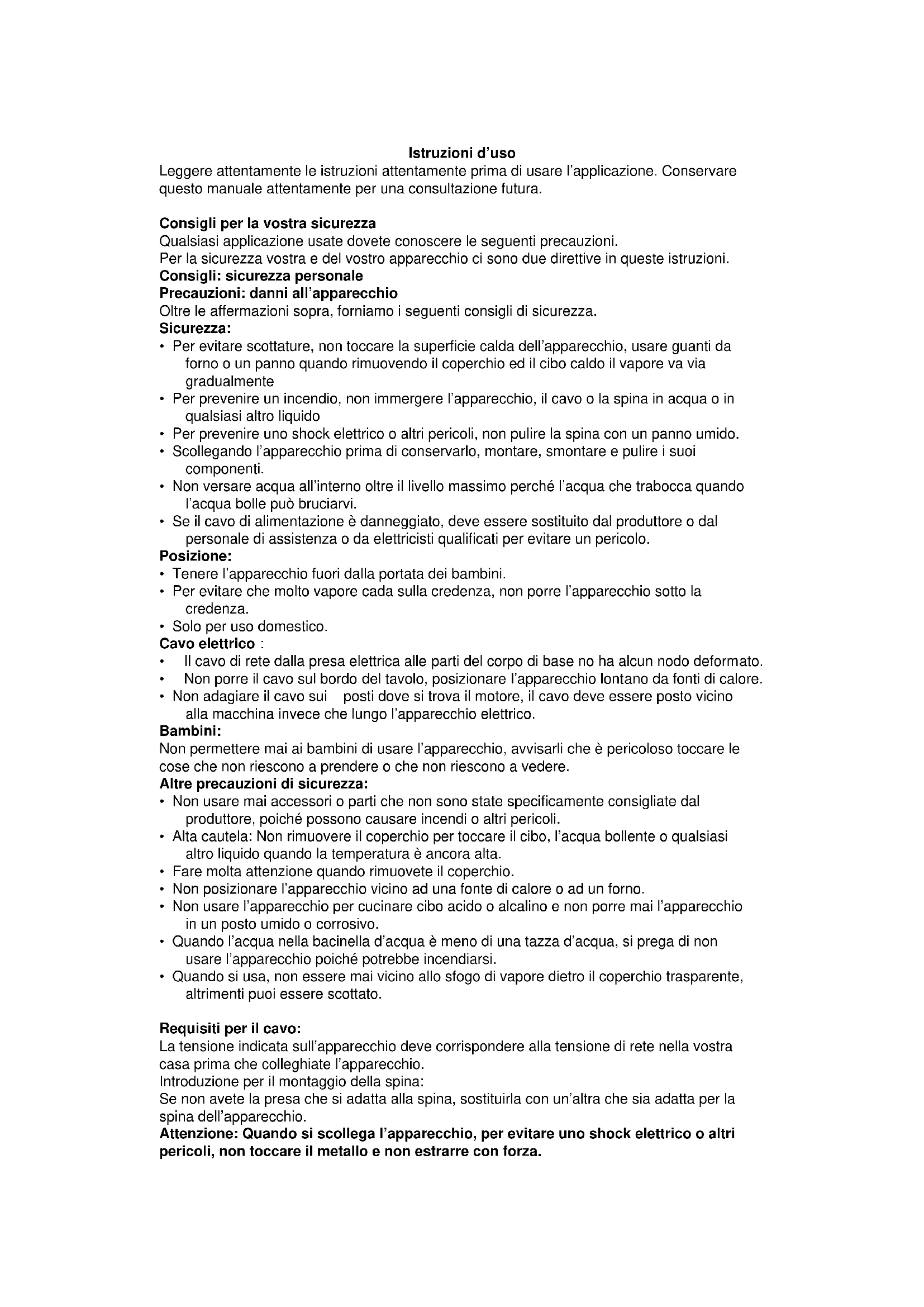 - Per evitare scottature, non toccare la superficie calda dell’apparecchio, usare guanti da forno o un panno quando rimuovendo il coperchio ed il cibo caldo il vapore va via gradualmente