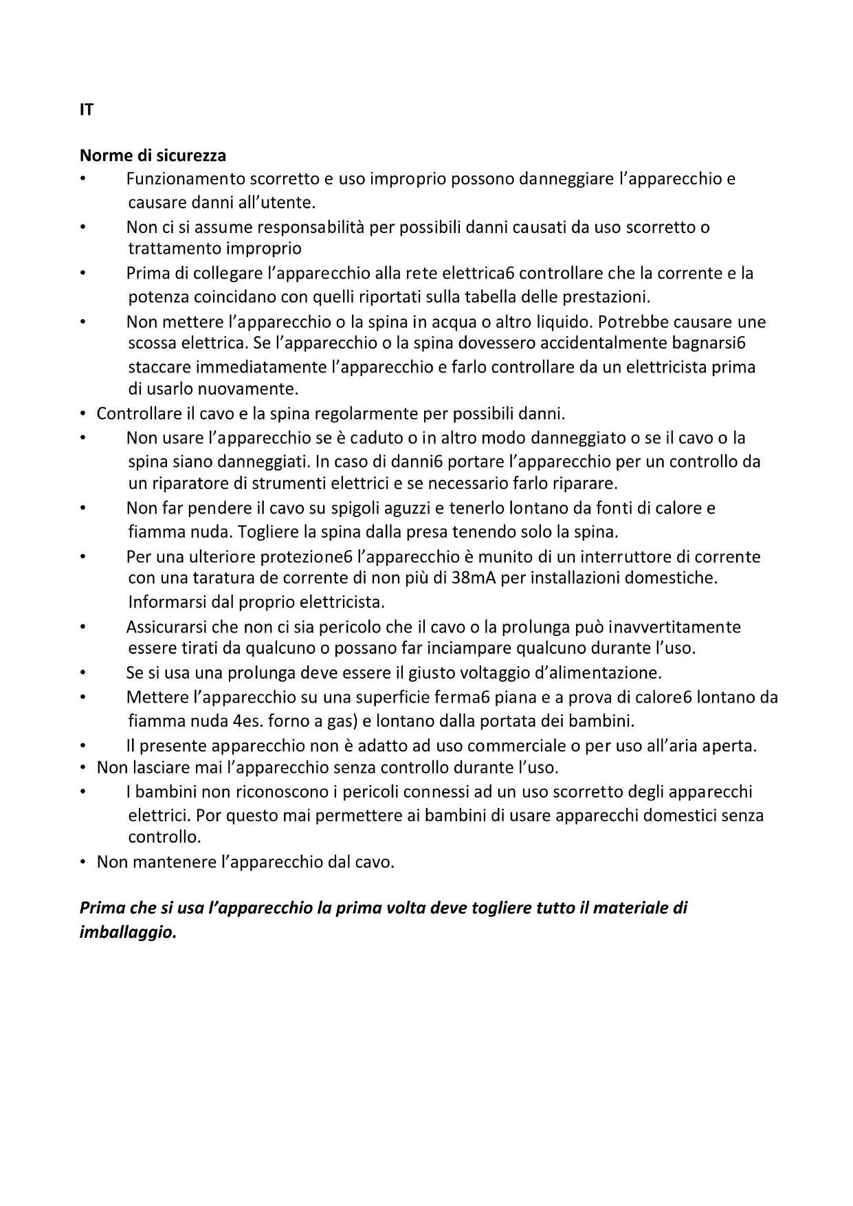 - Prima di collegare l’apparecchio alla rete elettrica, controllare che la corrente e la potenza coincidano con quelli riportati sulla tabella delle prestazioni.