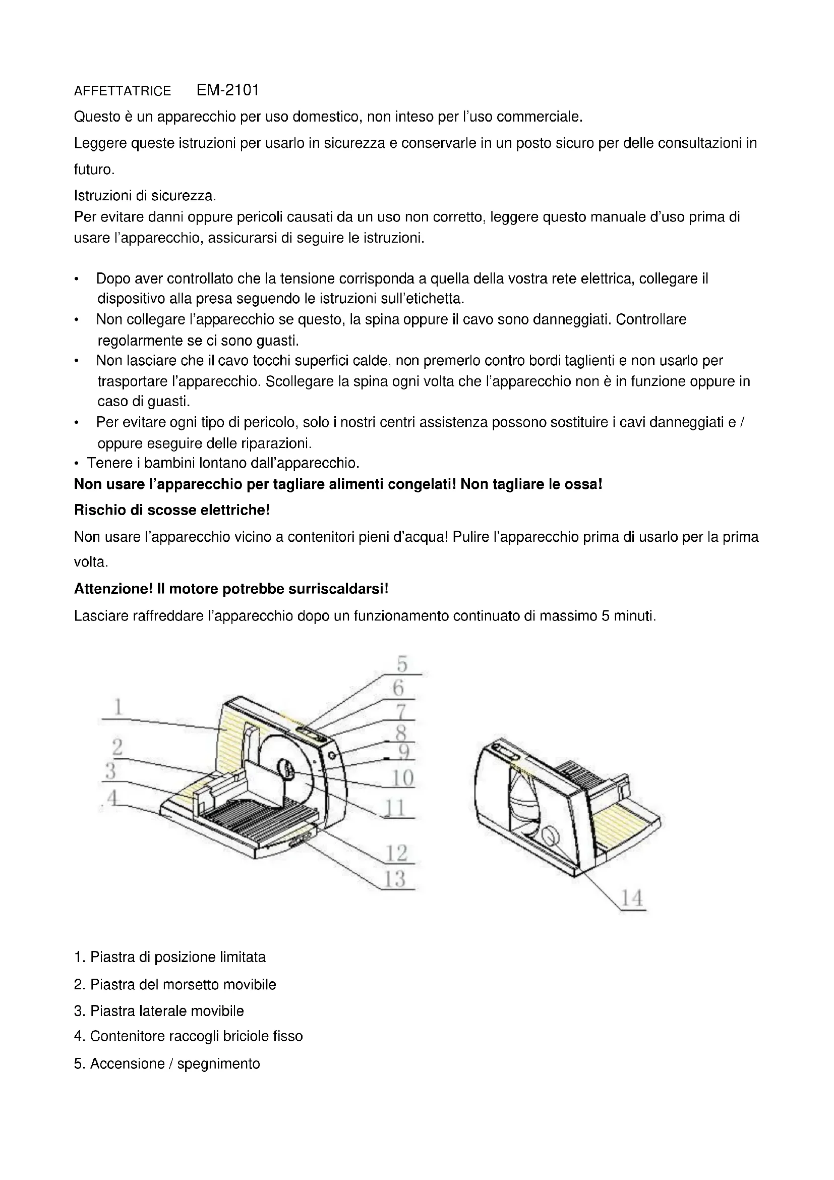 Descrizione generale: Nome del prodotto: affettatrice Modello del prodotto: HC3001/EM-2101 Intervallo di potenza: 230V~, 50Hz, 120W Lama di acciaio inossidabile da 170 mm. Spessore del taglio: <1.5 cm Istruzioni di funzionamento Mettere l’apparecchio su una superficie liscia, piegare il tavolo e fissare la manopola (13) Montare il carrello, attaccare la piastra laterale movibile (3) verticalmente nella scanalatura di guida laterale e metterlo sul tavolo. Attaccare la piastra del morsetto movibile (2) sulla piastra laterale movibile (3). Regolare lo spessore di taglio con la manopola (14) Funzionamento momentaneo: Premere l’interruttore di protezione Regolare l’interruttore prod per scegliere la velocità di rotazione. Premere il pulsante di protezione, quindi premere il pulsante ON/OFF finché la lama non inizia a girare. per fermare l’apparecchio, premere il pulsante di protezione e rilasciare il pulsante ON/OFF. Attenzione: Non regolare l’interruttore movibile mentre l’apparecchio è in funzione. Pericoli causati dalla lama - La lama continua a girare per un poco quando l’apparecchio viene spento. - Non mettere mai le mani vicino la lama. Controllo della velocità Controllo della velocità di taglio. Se l’alimento è molto morbido (ad esempio formaggio), mettere la velocità su MIN. Usare sempre il carrello ed il porta residui!Non rimuovere il carrello ed il porta residui a meno che la misura e la forma dell’alimento che deve essere tagliato non impedisca l’uso del carrello e del porta residui. Suggerimento: Tagliare prima la salsiccia ed il formaggio e poi il pane: in questo modo sarà più facile pulire l’apparecchio. Dopo l’uso e la pulizia dell’apparecchio, rilasciare il tavolo e chiudere l’apparecchio. Avvolgere il cavo e bloccare la spina in posizione. Tenere lontano dalla portata dei bambini: !La lama tagliente potrebbe causare incidenti. Prima di pulire l’apparecchio tirare la spina e rimuovere la lama. Toccare solo il pulsante fisso. Non toccare mai il bordo tagliente. Attenzione! le superfici possono essere danneggiate. Non usare detergenti aggressivi. Pulire l’apparecchio e gli accessori con un panno umido e lasciarli asciugare. Fare attenzione poiché questa lama è molto affilata Pulizia della lama circolare. Pulire uniformemente la lama circolare sempre dopo l’uso e solo a mano. Girare il porta lama in direzione oraria, metterlo in posizione verticale ed estrarre la lama circolare. Se la lama è molto sporca, il coperchio può essere rimosso, partendo dal bordo esterno. Quando si rimette la lama, assicurarsi che si blocchi bene in posizione = il pomello fisso in posizione orizzontale. ! Rischio di incidenti se cade la lama Garanzia Le condizioni della garanzia per questo apparecchio sono definite dai nostri rappresentanti nel paese in cui si vende il prodotto. I dettagli relativi a queste condizioni possono essere richiesti presso il proprio rivenditore. Lo scontrino oppure la ricevuta devono essere presentati quando si fa qualche reclamo secondo i termini di questa garanzia.