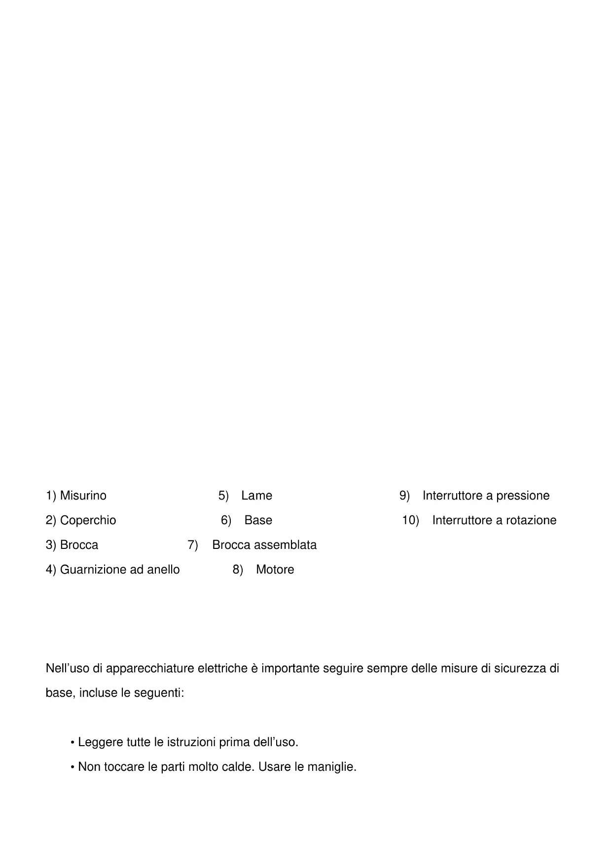 - Non inserire nessuno dei seguenti materiali all’interno dell’apparecchio: Carta, cartone, plastica e simili. CONSERVA QUESTE ISTRUZIONIQUESTO APPARECCHIO E’ DESTINATO AL SOLO USO DOMESTICO! Primo Utilizzo Tutte le parti del frullatore devono essere pulite prima di essere usate per la prima volta.. (vedi la Sezione: Pulizia). Tirar fuori il cavo di alimentazione per la lunghezza necessaria dal suo alloggiamento alla base dell’apparecchio e collegarlo alla presa di corrente. Assemblare la Brocca: Inserire la guarnizione ad anello (4) sulla parte superiore del componente delle lame (5). Mettere il componente delle lame con la guarnizione nella base da avvitare alla base (6). Inserire la base così assemblata alla base della brocca ed avvitare con cura. Montare il misurino (1) sul coperchio (2). Assicurare il coperchio sulla brocca e premere. Inserire la Brocca: