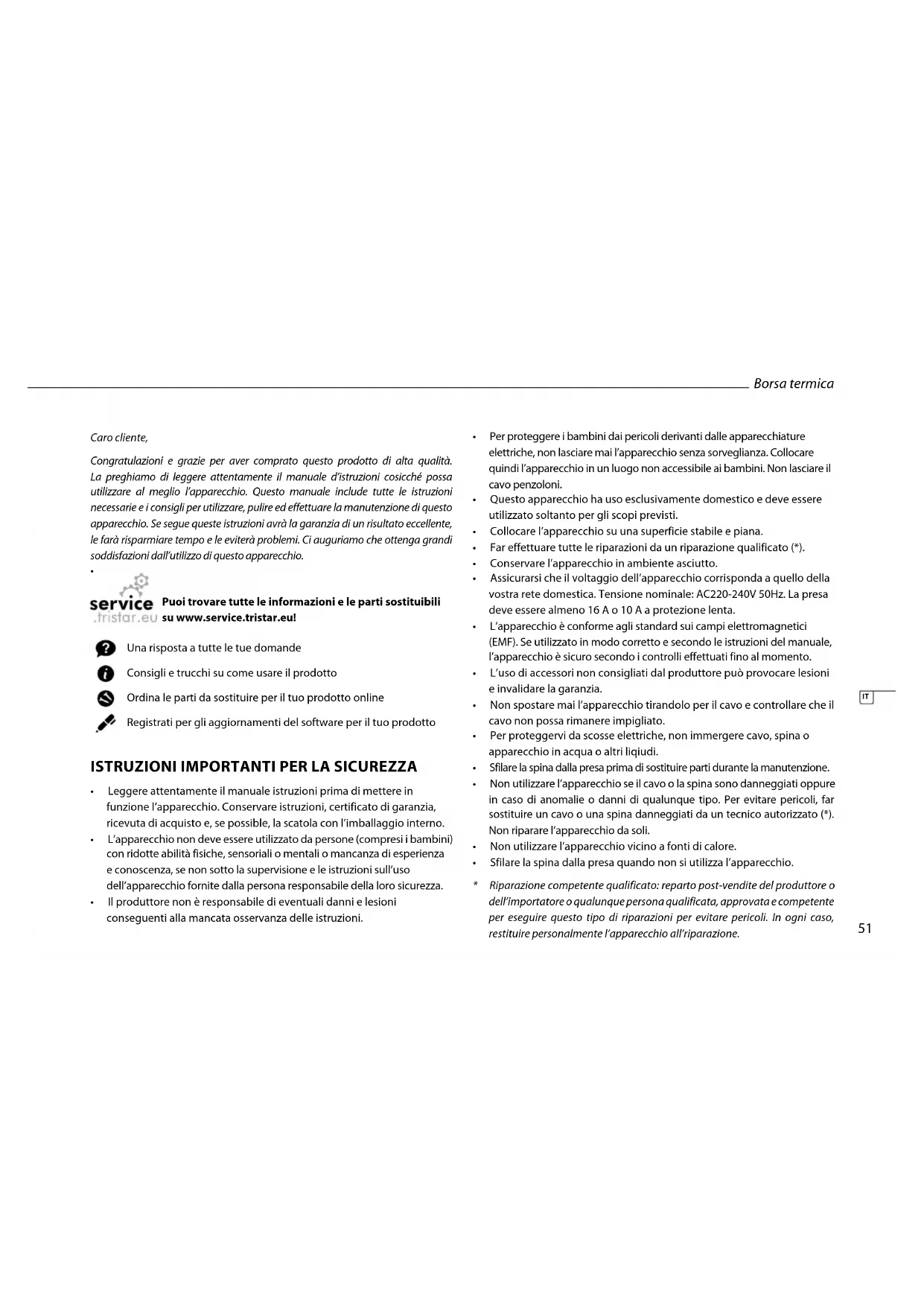 - Riparazione competente qualificato: reparto post-vendite del produttore o dell’importatore o qualunque persona qualificata, approvata e competente per eseguire questo tipo di riparazioni per evitare pericoli. In ogni caso, restituire personalmente l’apparecchio all’riparazione. Borsa termica52 IMPORTANTE Leggere il manuale delle istruzioni con attenzione in modo da avere una buona conoscenza dell’apparecchio prima di metterlo in funzione. Conservare le istruzioni per eventuali consultazioni.