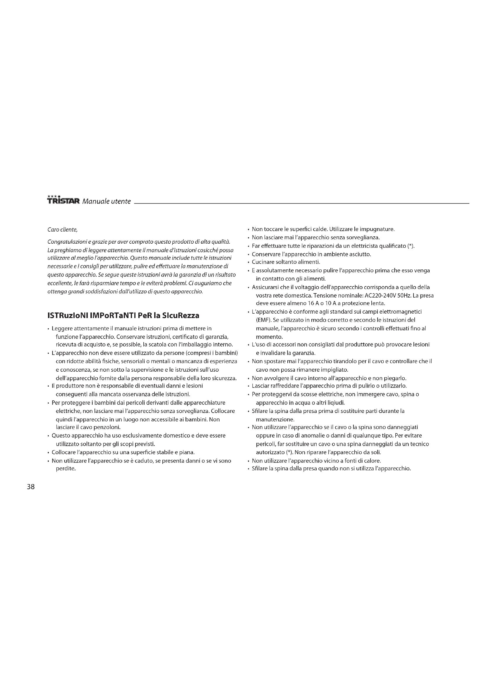 - Eventuali danni causati dal mancato rispetto delle indicazioni fornite nel manuale di istruzioni annulleranno la garanzia. Tristar non è responsabile per qualsiasi danno conseguente.