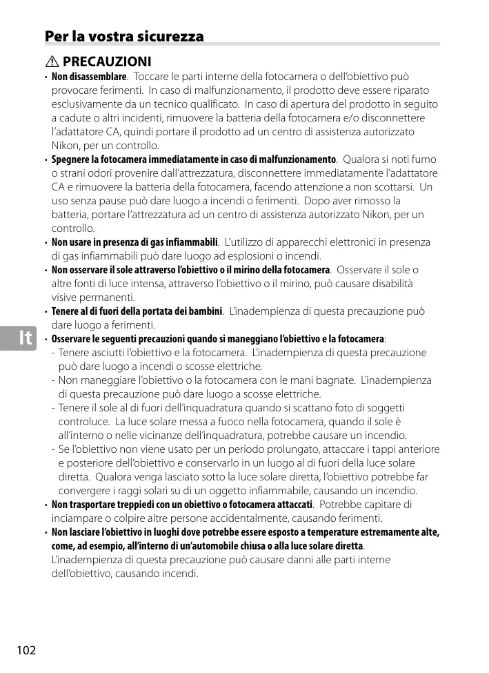 • Non disassemblare. Toccare le parti interne della fotocamera o dell’obiettivo può provocare ferimenti. In caso di malfunzionamento, il prodotto deve essere riparato esclusivamente da un tecnico qualificato. In caso di apertura del prodotto in seguito a cadute o altri incidenti, rimuovere la batteria della fotocamera e/o disconnettere l’adattatore CA, quindi portare il prodotto ad un centro di assistenza autorizzato Nikon, per un controllo. • Spegnere la fotocamera immediatamente in caso di malfunzionamento. Qualora si noti fumo o strani odori provenire dall’attrezzatura, disconnettere immediatamente l’adattatore CA e rimuovere la batteria della fotocamera, facendo attenzione a non scottarsi. Un uso senza pause può dare luogo a incendi o ferimenti. Dopo aver rimosso la batteria, portare l’attrezzatura ad un centro di assistenza autorizzato Nikon, per un controllo. • Non usare in presenza di gas infiammabili. L’utilizzo di apparecchi elettronici in presenza di gas infiammabili può dare luogo ad esplosioni o incendi. • Non osservare il sole attraverso l’obiettivo o il mirino della fotocamera. Osservare il sole o altre fonti di luce intensa, attraverso l’obiettivo o il mirino, può causare disabilità visive permanenti. • Tenere al di fuori della portata dei bambini. L’inadempienza di questa precauzione può dare luogo a ferimenti. • Osservare le seguenti precauzioni quando si maneggiano l’obiettivo e la fotocamera: - Tenere asciutti l’obiettivo e la fotocamera. L’inadempienza di questa precauzione può dare luogo a incendi o scosse elettriche. - Non maneggiare l’obiettivo o la fotocamera con le mani bagnate. L’inadempienza di questa precauzione può dare luogo a scosse elettriche. - Tenere il sole al di fuori dell’inquadratura quando si scattano foto di soggetti controluce. La luce solare messa a fuoco nella fotocamera, quando il sole è all’interno o nelle vicinanze dell’inquadratura, potrebbe causare un incendio. - Se l’obiettivo non viene usato per un periodo prolungato, attaccare i tappi anteriore e posteriore dell’obiettivo e conservarlo in un luogo al di fuori della luce solare diretta. Qualora venga lasciato sotto la luce solare diretta, l’obiettivo potrebbe far convergere i raggi solari su di un oggetto infiammabile, causando un incendio. • Non trasportare treppiedi con un obiettivo o fotocamera attaccati. Potrebbe capitare di inciampare o colpire altre persone accidentalmente, causando ferimenti. • Non lasciare l’obiettivo in luoghi dove potrebbe essere esposto a temperature estremamente alte, come, ad esempio, all’interno di un’automobile chiusa o alla luce solare diretta. L’inadempienza di questa precauzione può causare danni alle parti interne dell’obiettivo, causando incendi.