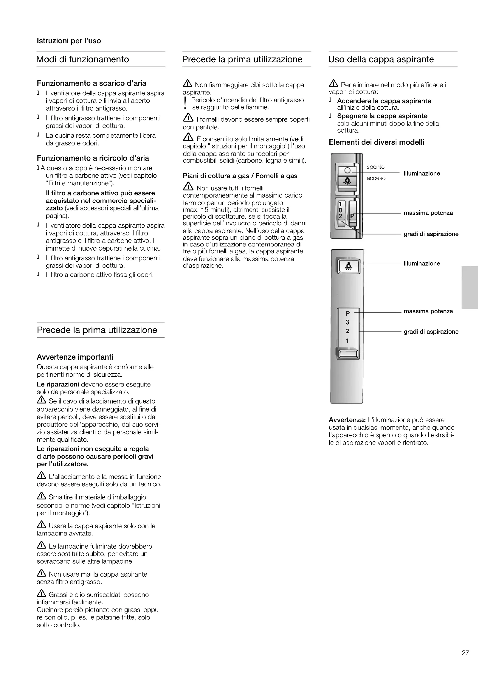 l filtro antigrasso trattiene i componentigrassi dei vapori di cottura. La cucina resta completamente liberada grasso e odori. Funzionamento a ricircolo d'aria q A questo scopo è necessario montareun filtro a carbone attivo (vedi capitolo"Filtri e manutenzione").Il filtro a carbone attivo può essereacquistato nel commercio speciali-zzato (vedi accessori speciali all'ultimapagina). Il ventilatore della cappa aspirante aspirai vapori di cottura, attraverso il filtro antigrasso e il filtro a carbone attivo, liimmette di nuovo depurati nella cucina. Il filtro antigrasso trattiene i componentigrassi dei vapori di cottura. Il filtro a carbone attivo fissa gli odori. Precede la prima utilizzazione Avvertenze importanti Questa cappa aspirante è conforme allepertinenti norme di sicurezza.Le riparazioni devono essere eseguitesolo da personale specializzato. Se il cavo di allacciamento di questo apparecchio viene danneggiato, al fine dievitare pericoli, deve essere sostituito dalproduttore dell'apparecchio, dal suo servi-zio assistenza clienti o da personale simil-mente qualificato.Le riparazioni non eseguite a regola d'arte possono causare pericoli graviper l'utilizzatore. L'allacciamento e la messa in funzione devono essere eseguiti solo da un tecnico. Smaltire il materiale d'imballaggio secondo le norme (vedi capitolo "Istruzioniper il montaggio"). Usare la cappa aspirante solo con le lampadine avvitate. Le lampadine fulminate dovrebbero essere sostituite subito, per evitare unsovraccario sulle altre lampadine. Non usare mai la cappa aspirante senza filtro antigrasso. Grassi e olio surriscaldati possono infiammarsi facilmente.Cucinare perciò pietanze con grassi oppu-re con olio, p. es. le patatine fritte, solosotto controllo. Non fiammeggiare cibi sotto la cappa aspirante.Pericolo d'incendio del filtro antigrasso ! se raggiunto delle fiamme. I fornelli devono essere sempre coperti con pentole. É consentito solo limitatamente (vedi capitolo "Istruzioni per il montaggio") l'usodella cappa aspirante su focolari per combustibili solidi (carbone, legna e simili).Piani di cottura a gas / Fornelli a gas Non usare tutti i fornelli contemporaneamente al massimo caricotermico per un periodo prolungato (max. 15 minuti), altrimenti sussiste il pericolo di scottature, se si tocca la superficie dell’involucro o pericolo di dannialla cappa aspirante. Nell’uso della cappaaspirante sopra un piano di cottura a gas,in caso d’utilizzazione contemporanea ditre o più fornelli a gas, la cappa aspirantedeve funzionare alla massima potenza d’aspirazione. Modi di funzionamento Istruzioni per l’uso Precede la prima utilizzazione Per eliminare nel modo più efficace i vapori di cottura: Accendere la cappa aspiranteall'inizio della cottura. Spegnere la cappa aspirantesolo alcuni minuti dopo la fine della cottura. Elementi dei diversi modelli Avvertenza: L'illuminazione può essereusata in qualsiasi momento, anche quandol'apparecchio è spento o quando l'estraibi-le di aspirazione vapori è rientrato.