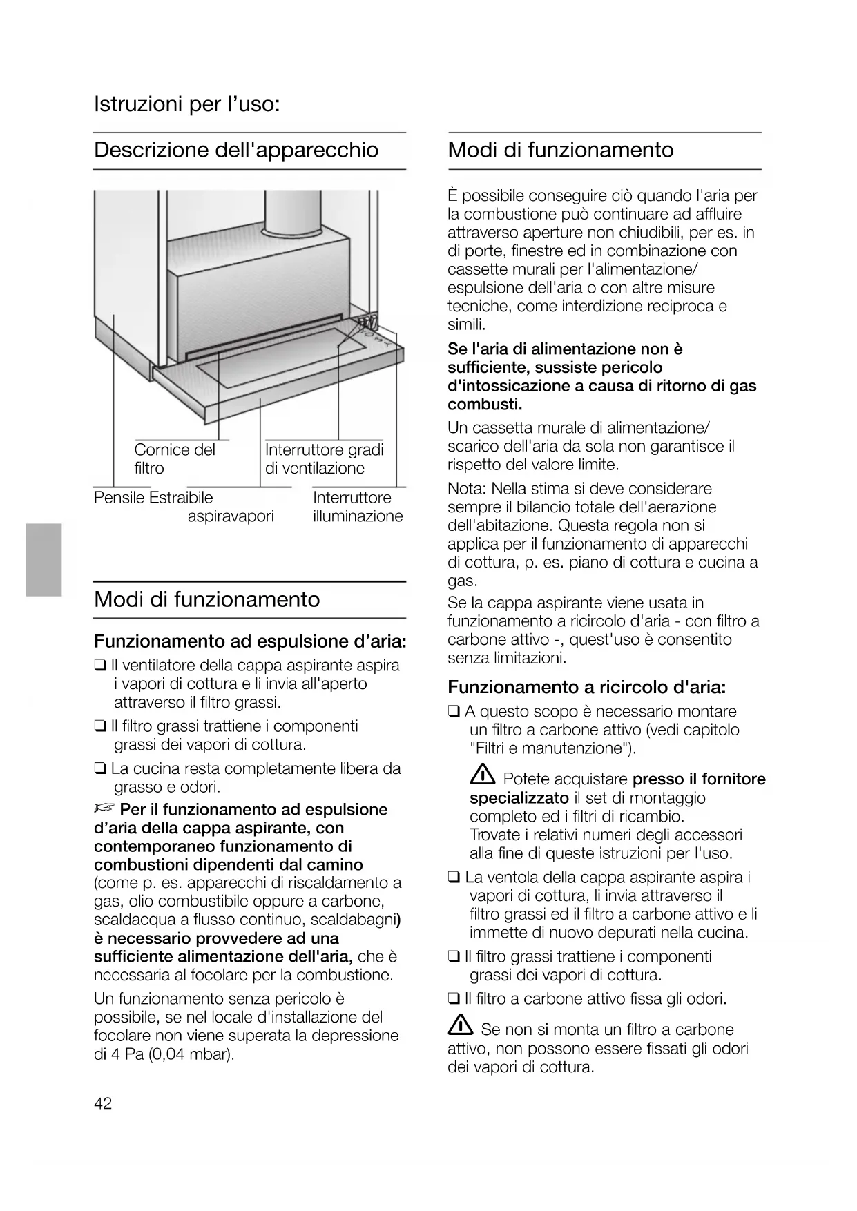 Se la presa con contatto di terra dopo il montaggio della cappa aspirante non fosse più accessibile, deve essere disponibile un dispositivo di separazione come nell'allacciamento fisso. In caso di necessità dell'allacciamento fisso: La cappa aspirante deve essere collegata solo da un elettroinstallatore registrato presso la competente azienda di distribuzione dell'energia elettrica. Nell'impianto deve essere previsto un dispositivo di separazione. Come dispositivi di separazione s'intendono gli interruttori con un'apertura onnipolare tra i contatti superiore a 3 mm. Rientrano tra questi gli interruttori automatici e i relè. Dati elettrici: Da vedere sulla targhetta del modello dopo lo smontaggio del portafiltro nel vano interno dell’apparecchio. 몇 In caso di riparazioni togliere completamente corrente all'apparecchio. Lunghezza del cavo di allacciamento: 1,30 m. Questa cappa aspirante è conforme alle norme CE sulla schermatura contro i radiodisturbi. Peso in kg: Scarico d’aria Ricircolo d’aria 7,0 8,0 Con riserva di modifiche nel quadro dell'evoluzione tecnica.55 Filter frame Ventilator switches Wall cupboard Pull-out vapour extractor Light switch Appliance description Operating modes Exhaust-air mode: ❑ The extractor-hood fan extracts the kitchen vapours and conveys them through the grease filter into the atmosphere. ❑ The grease filter absorbs the solid particles in the kitchen vapours. ❑ The kitchen is kept almost free of grease and odours.