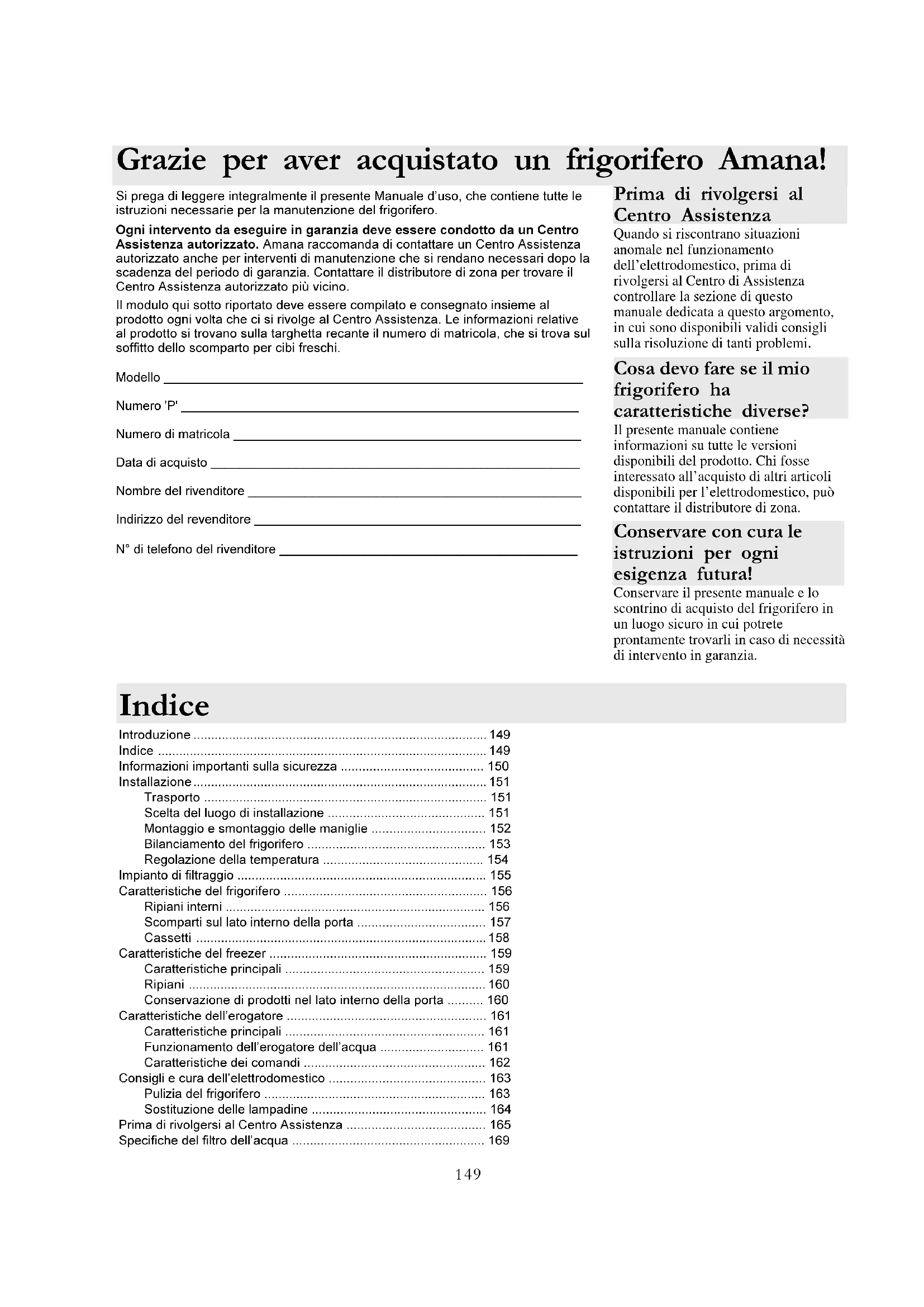 - Si prega di leggere integralmente il presente Manuale duso, che contiene tutte le istruzioni necessarie per la manutenzione del frigorifero. Ogni intervento da eseguire in garanzia deve essere condotto da un Centro Assistenza autorizzato. Amana raccomanda di contattare un Centro Assistenza autorizzato anche per interventi di manutenzione che si rendano necessari dopo la scadenza del periodo di garanzia. Contattare il distributore di zona per trovare il Centro Assistenza autorizzato più vicino. Il modulo qui sotto riportato deve essere compilato e consegnato insieme al prodotto ogni volta che ci si rivolge al Centro Assistenza. Le informazioni relative al prodotto si trovano sulla targhetta recante il numero di matricola, che si trova sul soffitto dello scomparto per cibi freschi. Modello ___________________________________________________________ Numero 'P' ________________________________________________________ Numero di matricola _________________________________________________ Data di acquisto ____________________________________________________ Nombre del rivenditore _______________________________________________ Indirizzo del revenditore ______________________________________________ N° di telefono del rivenditore __________________________________________ Prima di rivolgersi al Centro Assistenza Quando si riscontrano situazioni anomale nel funzionamento dell’elettrodomestico, prima di rivolgersi al Centro di Assistenza controllare la sezione di questo manuale dedicata a questo argomento, in cui sono disponibili validi consigli sulla risoluzione di tanti problemi. Grazie per aver acquistato un frigorifero Amana! Il presente manuale contiene informazioni su tutte le versioni disponibili del prodotto. Chi fosse interessato all’acquisto di altri articoli disponibili per l’elettrodomestico, può contattare il distributore di zona. Conservare con cura le istruzioni per ogni esigenza futura! Conservare il presente manuale e lo scontrino di acquisto del frigorifero in un luogo sicuro in cui potrete prontamente trovarli in caso di necessità di intervento in garanzia. Cosa devo fare se il mio frigorifero ha caratteristiche diverse? Introduzione p. 149