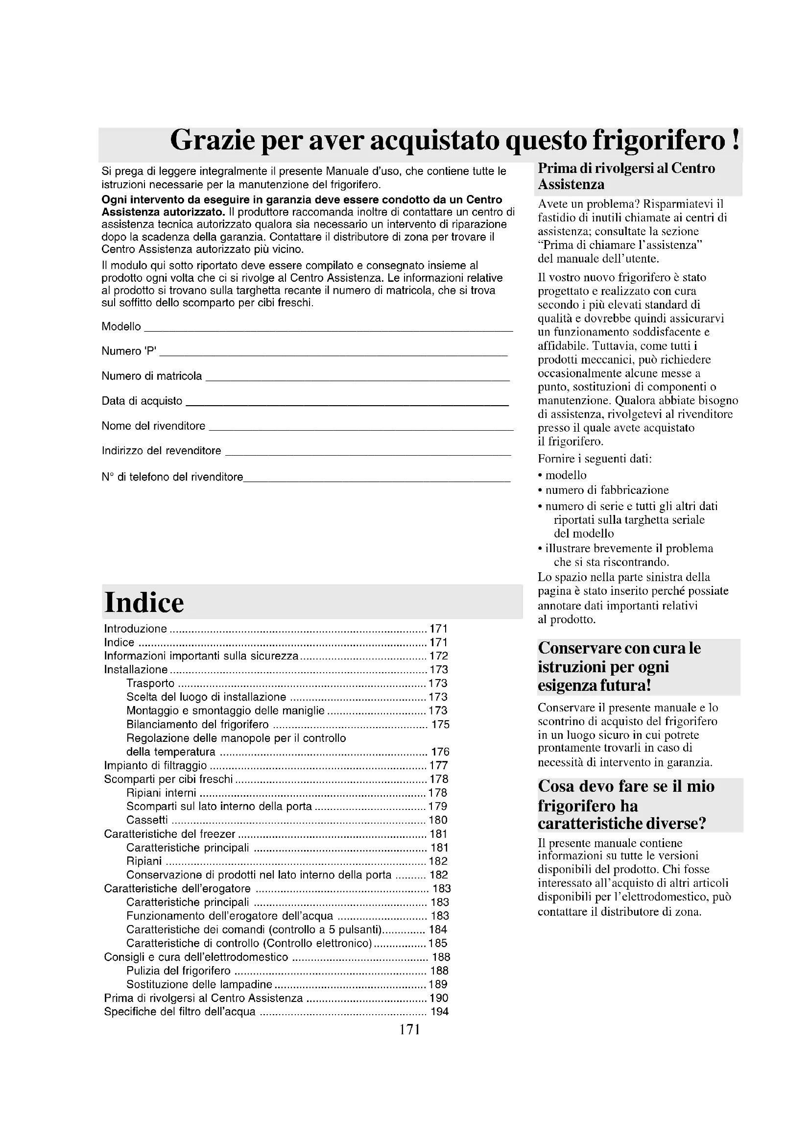- illustrare brevemente il problema che si sta riscontrando. Lo spazio nella parte sinistra della pagina è stato inserito perché possiate annotare dati importanti relativi al prodotto. Grazie per aver acquistato questo frigorifero ! Il presente manuale contiene informazioni su tutte le versioni disponibili del prodotto. Chi fosse interessato all’acquisto di altri articoli disponibili per l’elettrodomestico, può contattare il distributore di zona. Cosa devo fare se il mio frigorifero ha caratteristiche diverse? Introduzione ................................................................................... 171 Indice ............................................................................................. 171 Informazioni importanti sulla sicurezza......................................... 172 Installazione ................................................................................... 173 Trasporto ................................................................................ 173 Scelta del luogo di installazione ............................................ 173 Montaggio e smontaggio delle maniglie ................................ 173 Bilanciamento del frigorifero .................................................. 175 Regolazione delle manopole per il controllo della temperatura ................................................................... 176 Impianto di filtraggio ...................................................................... 177 Scomparti per cibi freschi .............................................................. 178 Ripiani interni ......................................................................... 178 Scomparti sul lato interno della porta .................................... 179 Cassetti .................................................................................. 180 Caratteristiche del freezer ............................................................. 181 Caratteristiche principali ........................................................ 181 Ripiani .................................................................................... 182 Conservazione di prodotti nel lato interno della porta .......... 182 Caratteristiche dell’erogatore ........................................................ 183 Caratteristiche principali ........................................................ 183 Funzionamento dell’erogatore dell’acqua ............................. 183 Caratteristiche dei comandi (controllo a 5 pulsanti).............. 184 Caratteristiche di controllo (Controllo elettronico)................. 185 Consigli e cura dell’elettrodomestico ............................................ 188 Pulizia del frigorifero .............................................................. 188 Sostituzione delle lampadine ................................................. 189 Prima di rivolgersi al Centro Assistenza ....................................... 190 Specifiche del filtro dell’acqua ...................................................... 194 Indice Conservare con cura le istruzioni per ogni esigenza futura! Conservare il presente manuale e lo scontrino di acquisto del frigorifero in un luogo sicuro in cui potrete prontamente trovarli in caso di necessità di intervento in garanzia.172 Informazioni importanti sulla sicurezza Vista di insieme della macchina