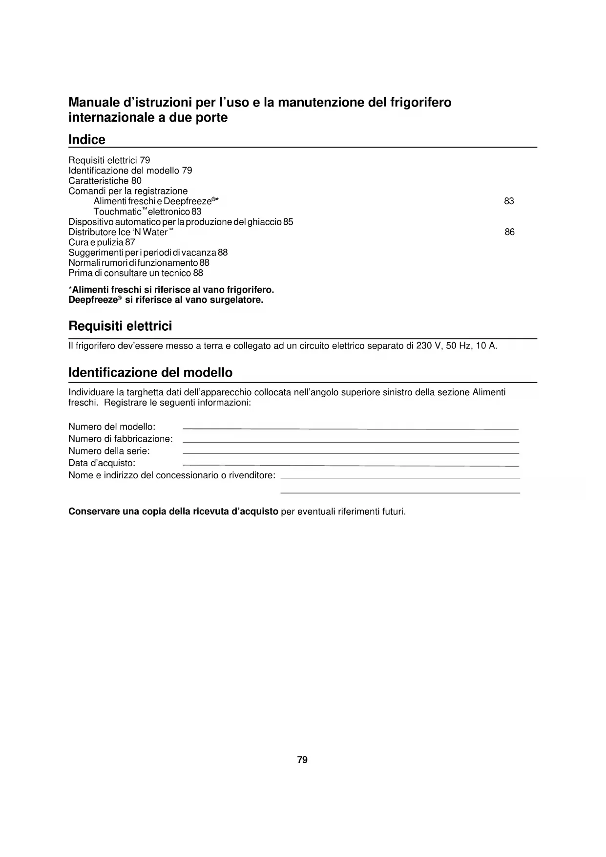 si riferisce al vano surgelatore. Requisiti elettrici Il frigorifero dev’essere messo a terra e collegato ad un circuito elettrico separato di 230 V, 50 Hz, 10 A. Identificazione del modello Individuare la targhetta dati dell’apparecchio collocata nell’angolo superiore sinistro della sezione Alimenti freschi. Registrare le seguenti informazioni: Numero del modello: Numero di fabbricazione: Numero della serie: Data d’acquisto: Nome e indirizzo del concessionario o rivenditore: Conservare una copia della ricevuta d’acquisto per eventuali riferimenti futuri.80 Caratteristiche Sezione Alimenti freschi (Frigorifero)
