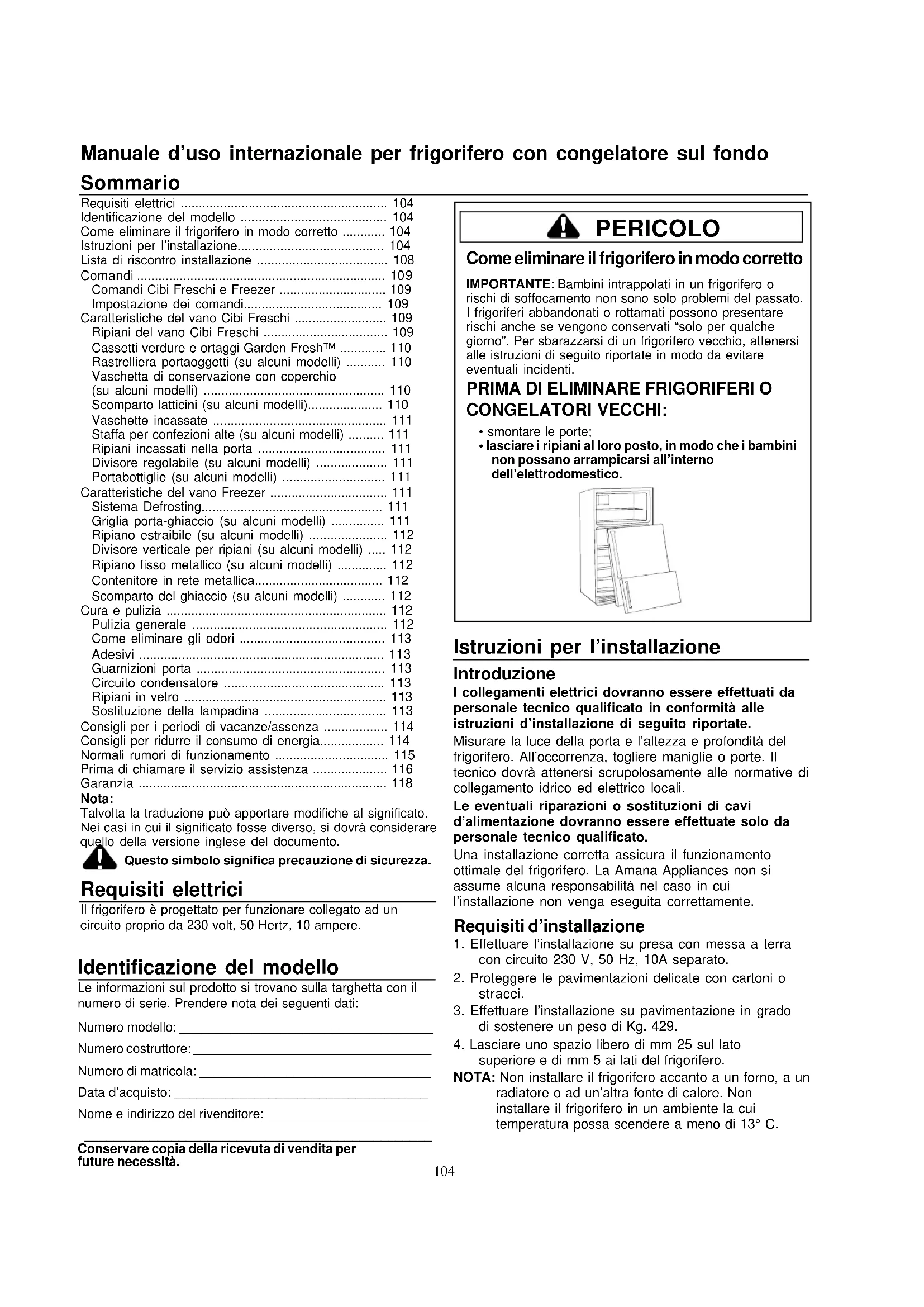 Una installatione corretta assicura il funzionamento ottimale del frigorifero. La Amana Appliances non si assume alcuna responsabilita nel caso in cui l'installatione non venga eseguita correttamente.