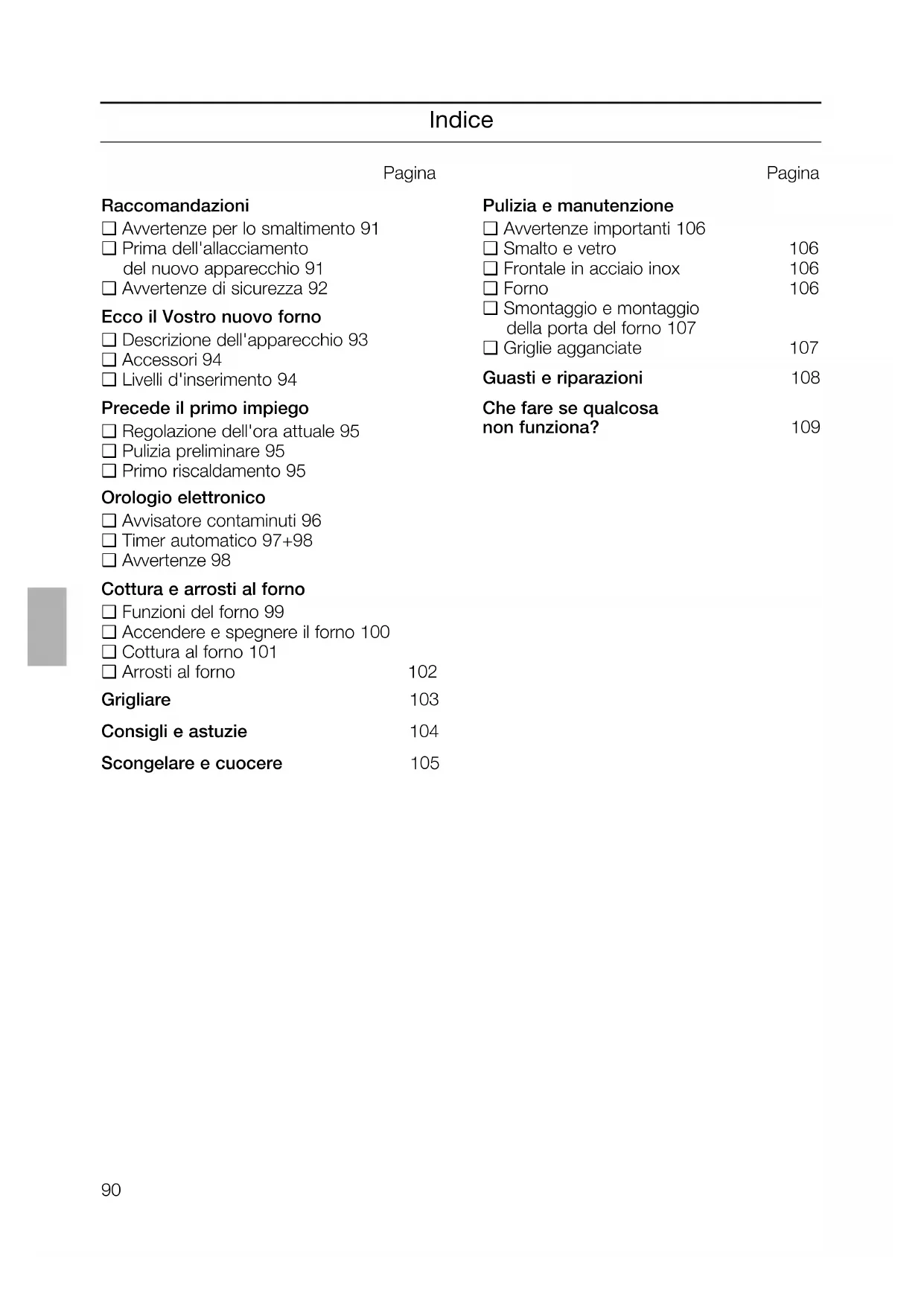 Stroomtoevoer is gedurende korte tijd onderbroken geweest Tijd opnieuw instellen. … wanneer de oven plotseling niet meer werken? Tijdschakelaar is ingesteld op auto- matische tijdschakeling. Tijdschakelaar instellen op werking zonder automatische tijdschakeling: toets E indrukken.90 Indice Pagina Raccomandazioni ❑ Avvertenze per lo smaltimento 91 ❑ Prima dell'allacciamento del nuovo apparecchio 91 ❑ Avvertenze di sicurezza 92 Ecco il Vostro nuovo forno ❑ Descrizione dell'apparecchio 93 ❑ Accessori 94 ❑ Livelli d'inserimento 94 Precede il primo impiego ❑ Regolazione dell'ora attuale 95 ❑ Pulizia preliminare 95 ❑ Primo riscaldamento 95 Orologio elettronico ❑ Avvisatore contaminuti 96 ❑ Timer automatico 97+98 ❑ Avvertenze 98 Cottura e arrosti al forno ❑ Funzioni del forno 99 ❑ Accendere e spegnere il forno 100 ❑ Cottura al forno 101 ❑ Arrosti al forno 102 Grigliare 103 Consigli e astuzie 104 Scongelare e cuocere 105 Pagina Pulizia e manutenzione ❑ Avvertenze importanti 106 ❑ Smalto e vetro 106 ❑ Frontale in acciaio inox 106 ❑ Forno 106 ❑ Smontaggio e montaggio della porta del forno 107 ❑ Griglie agganciate 107 Guasti e riparazioni 108 Che fare se qualcosa non funziona? 109Avvertenze per lo smaltimento ❑ Gli apparecchi dismessi non sono rifiuti senza valore. Attraverso lo smaltimento ecologico possono essere recuperati materiali pregiati. Rendere inservibile l'apparecchio dismesso prima di rottamarlo. ❑ L'imballaggio ha protetto il Vostro nuovo apparecchio nel trasporto fino a Voi. Tutti i materiali utilizzati sono compatibili con l'ambiente e riciclabili. Siete pregati di collaborare, smaltendo l'imballaggio in modo ecologicamente corretto. Informatevi sulle attuali possibilità di smaltimento presso il Vostro rivenditore specializzato, oppure presso la Vostra amministrazione comunale. Prima dell'allacciamento del nuovo apparecchio ❑ Prima di usare il nuovo apparecchio, leggete attentamente le istruzioni per l'uso. Esse contengono informazioni importanti per la Vostra sicurezza, e anche per l'uso e la manutenzione dell'apparecchio. ❑ Questo libretto di istruzioni per l'uso èprevisto per più versioni dell' apparecchio. É possibile che siano descritti singoli particolari della dotazione, che non riguardano il Vostro apparecchio. ❑ Conservate bene il libretto delle istruzioni per l'uso e il montaggio, per un eventuale successivo proprietario. ❑ Se l'apparecchio è danneggiato, non dovete metterlo in funzione. ❑ Fate eseguire il montaggio e l'allaccia- mento elettrico dell'apparecchio solo da un tecnico concessionario, secondo le istruzioni e lo schema di allacciamento allegati. Se l'apparecchio viene collegato in modo errato, in caso di danni si estingue il diritto alla garanzia. ❑ I nostri apparecchi sono conformi alle pertinenti norme di sicurezza per gli apparecchi elettrici. Le riparazioni devono essere eseguite solo da tecnici del servizio assistenza clienti addestrati dal produttore. Le riparazioni non effettuate a regola d'arte possono causarvi pericoli considerevoli. Raccomandazioni