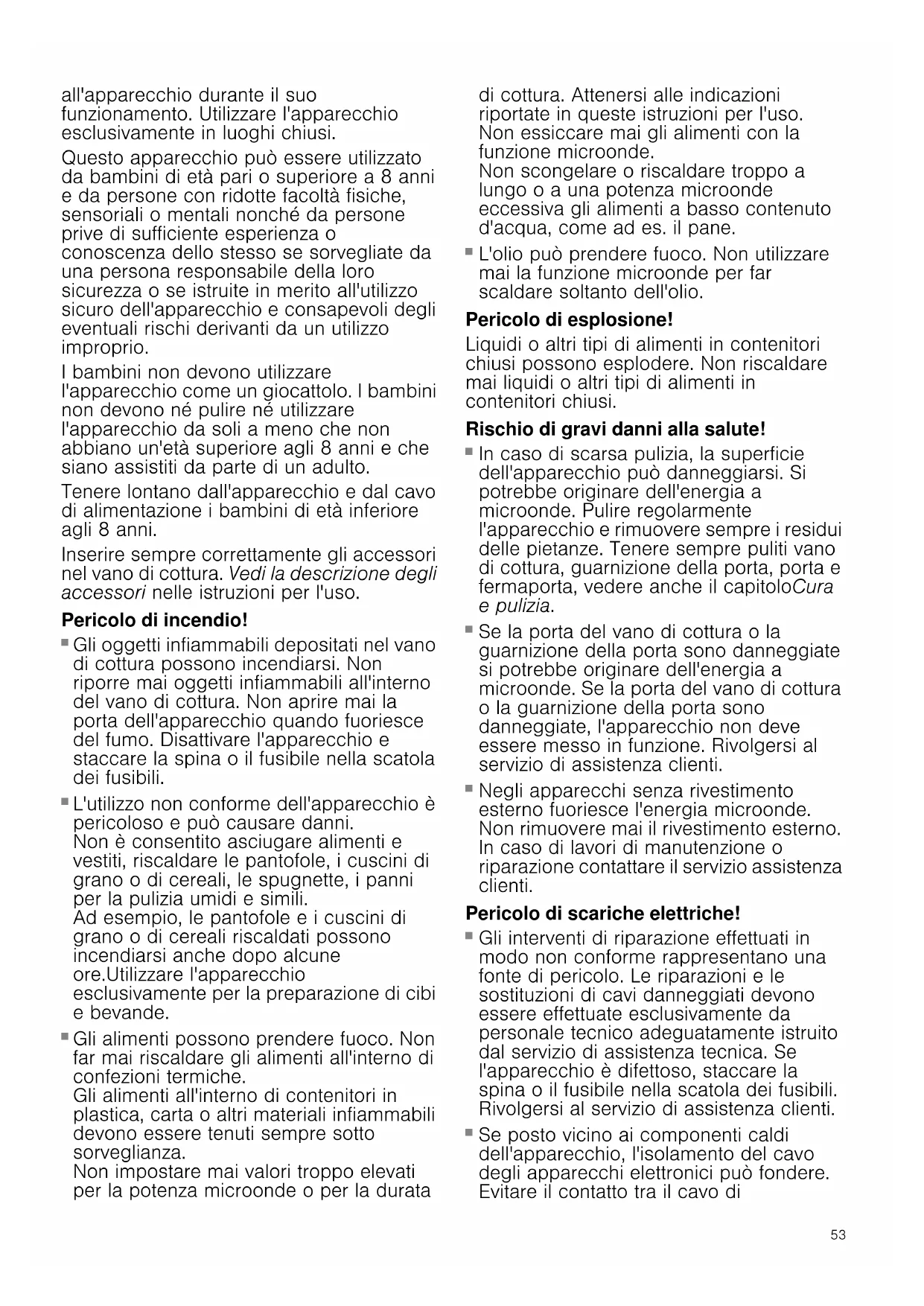 Gli alimenti possono prendere fuoco. Non far mai riscaldare gli alimenti all'interno di confezioni termiche. Gli alimenti all'interno di contenitori in plastica, carta o altri materiali infiammabili devono essere tenuti sempre sotto sorveglianza. Non impostare mai valori troppo elevati per la potenza microonde o per la durata di cottura. Attenersi alle indicazioni riportate in queste istruzioni per l'uso. Non essiccare mai gli alimenti con la funzione microonde. Non scongelare o riscaldare troppo a lungo o a una potenza microonde eccessiva gli alimenti a basso contenuto d'acqua, come ad es. il pane. Pericolo di incendio!