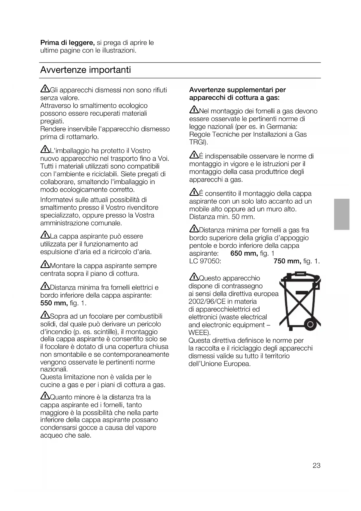 of ~ uigat. Daarna de toetsenloslaten. Wijziging van luchtafvoer naar luchtcirculatie: ❑ De indicatie C gaat na korte tijd uit. De elektrische besturing is ingesteld op werking met luchtcirculatie. Wijziging van luchtcirculatie nar luchtaf- voer: ❑ De indicatie ~ gaat na korte tijd uit. De elektronische besturing is nu inge- steld op luchtafvoer.23 Avvertenze importanti Avvertenze supplementari per apparecchi di cottura a gas: Nel montaggio dei fornelli a gas devono essere osservate le pertinenti norme di legge nazionali (per es. in Germania: Regole Tecniche per Installazioni a Gas TRGI). É indispensabile osservare le norme di montaggio in vigore e le istruzioni per il montaggio della casa produttrice degli apparecchi a gas. É consentito il montaggio della cappa aspirante con un solo lato accanto ad un mobile alto oppure ad un muro alto. Distanza min. 50 mm. Distanza minima per fornelli a gas fra bordo superiore della griglia d’appoggio pentole e bordo inferiore della cappa aspirante: 650 mm, fig. 1 LC 97050: 750 mm, fig. 1. Gli apparecchi dismessi non sono rifiuti senza valore. Attraverso lo smaltimento ecologico possono essere recuperati materiali pregiati. Rendere inservibile l'apparecchio dismesso prima di rottamarlo. L'imballaggio ha protetto il Vostro nuovo apparecchio nel trasporto fino a Voi. Tutti i materiali utilizzati sono compatibili con l'ambiente e riciclabili. Siete pregati di collaborare, smaltendo l'imballaggio in modo ecologicamente corretto. Informatevi sulle attuali possibilità di smaltimento presso il Vostro rivenditore specializzato, oppure presso la Vostra amministrazione comunale. La cappa aspirante può essere utilizzata per il funzionamento ad espulsione d'aria ed a ricircolo d'aria. Montare la cappa aspirante sempre centrata sopra il piano di cottura. Distanza minima fra fornelli elettrici e bordo inferiore della cappa aspirante: 550 mm, fig. 1. Sopra ad un focolare per combustibili solidi, dal quale può derivare un pericolo d'incendio (p. es. scintille), il montaggio della cappa aspirante è consentito solo se il focolare è dotato di una copertura chiusa non smontabile e se contemporaneamente vengono osservate le pertinenti norme nazionali. Questa limitazione non è valida per le cucine a gas e per i piani di cottura a gas. Quanto minore è la distanza tra la cappa aspirante ed i fornelli, tanto maggiore è la possibilità che nella parte inferiore della cappa aspirante possano condensarsi gocce a causa del vapore acqueo che sale. Prima di leggere, si prega di aprire le ultime pagine con le illustrazioni. Questo apparecchio dispone di contrassegno ai sensi della direttiva europea 2002/96/CE in materia di apparecchielettrici ed elettronici (waste electrical and electronic equipment – WEEE). Questa direttiva definisce le norme per la raccolta e il riciclaggio degli apparecchi dismessi valide su tutto il territorio dell’Unione Europea.24 Prima del montaggio Funzionamento a scarico d'aria Fig. 2 L'aria di scarico viene condotta verso l'alto, attraverso un pozzo di ventilazione, oppure direttamente all'aperto, attraverso la parete esterna.