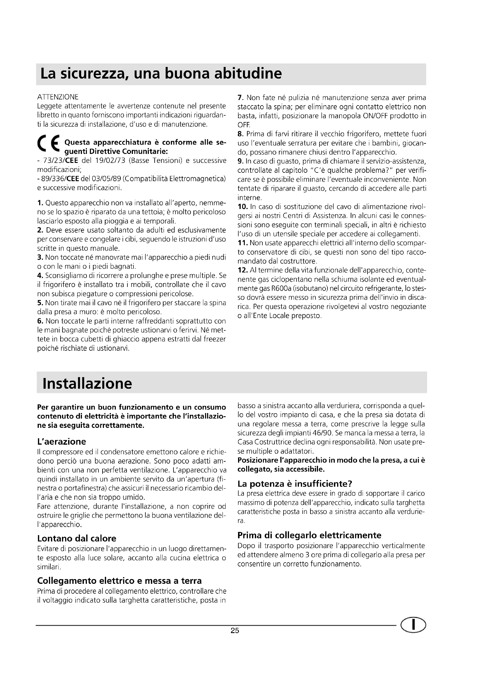 nente gas ciclopentano nella schiuma isolante ed eventual- mente gas R600a (isobutano) nel circuito refrigerante, lo stes- so dovrà essere messo in sicurezza prima dell'invio in disca- rica. Per questa operazione rivolgetevi al vostro negoziante o all'Ente Locale preposto. Installazione Per garantire un buon funzionamento e un consumo contenuto di elettricità è importante che l’installazio- ne sia eseguita correttamente. L’aerazione Il compressore ed il condensatore emettono calore e richie- dono perciò una buona aerazione. Sono poco adatti am- bienti con una non perfetta ventilazione. L’apparecchio va quindi installato in un ambiente servito da un’apertura (fi- nestra o portafinestra) che assicuri il necessario ricambio del- l’aria e che non sia troppo umido. Fare attenzione, durante l'installazione, a non coprire od ostruire le griglie che permettono la buona ventilazione del- l'apparecchio. Lontano dal calore Evitare di posizionare l'apparecchio in un luogo direttamen- te esposto alla luce solare, accanto alla cucina elettrica o similari. Collegamento elettrico e messa a terra Prima di procedere al collegamento elettrico, controllare che il voltaggio indicato sulla targhetta caratteristiche, posta in basso a sinistra accanto alla verduriera, corrisponda a quel- lo del vostro impianto di casa, e che la presa sia dotata di una regolare messa a terra, come prescrive la legge sulla sicurezza degli impianti 46/90. Se manca la messa a terra, la Casa Costruttrice declina ogni responsabilità. Non usate pre- se multiple o adattatori. Posizionare l’apparecchio in modo che la presa, a cui è collegato, sia accessibile. La potenza è insufficiente? La presa elettrica deve essere in grado di sopportare il carico massimo di potenza dell’apparecchio, indicato sulla targhetta caratteristiche posta in basso a sinistra accanto alla verdurie- ra. Prima di collegarlo elettricamente Dopo il trasporto posizionare l’apparecchio verticalmente ed attendere almeno 3 ore prima di collegarlo alla presa per consentire un corretto funzionamento. ATTENZIONE Leggete attentamente le avvertenze contenute nel presente libretto in quanto forniscono importanti indicazioni riguardan- ti la sicurezza di installazione, d’uso e di manutenzione. Questa apparecchiatura è conforme alle se- guenti Direttive Comunitarie: - 73/23/CEE del 19/02/73 (Basse Tensioni) e successive modificazioni; - 89/336/CEE del 03/05/89 (Compatibilità Elettromagnetica) e successive modificazioni.