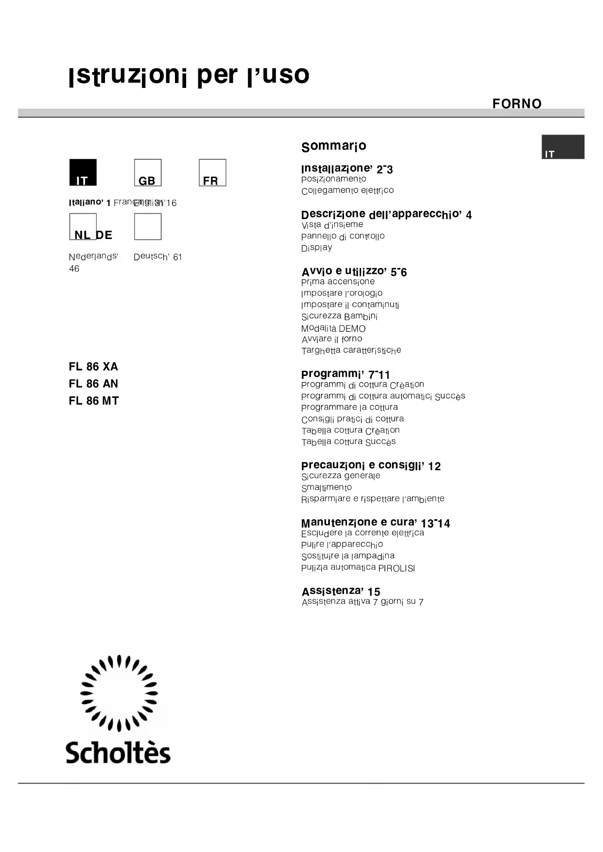 FL 86 XA MT - Forno SCHOLTES - Manuale utente e istruzioni gratuiti