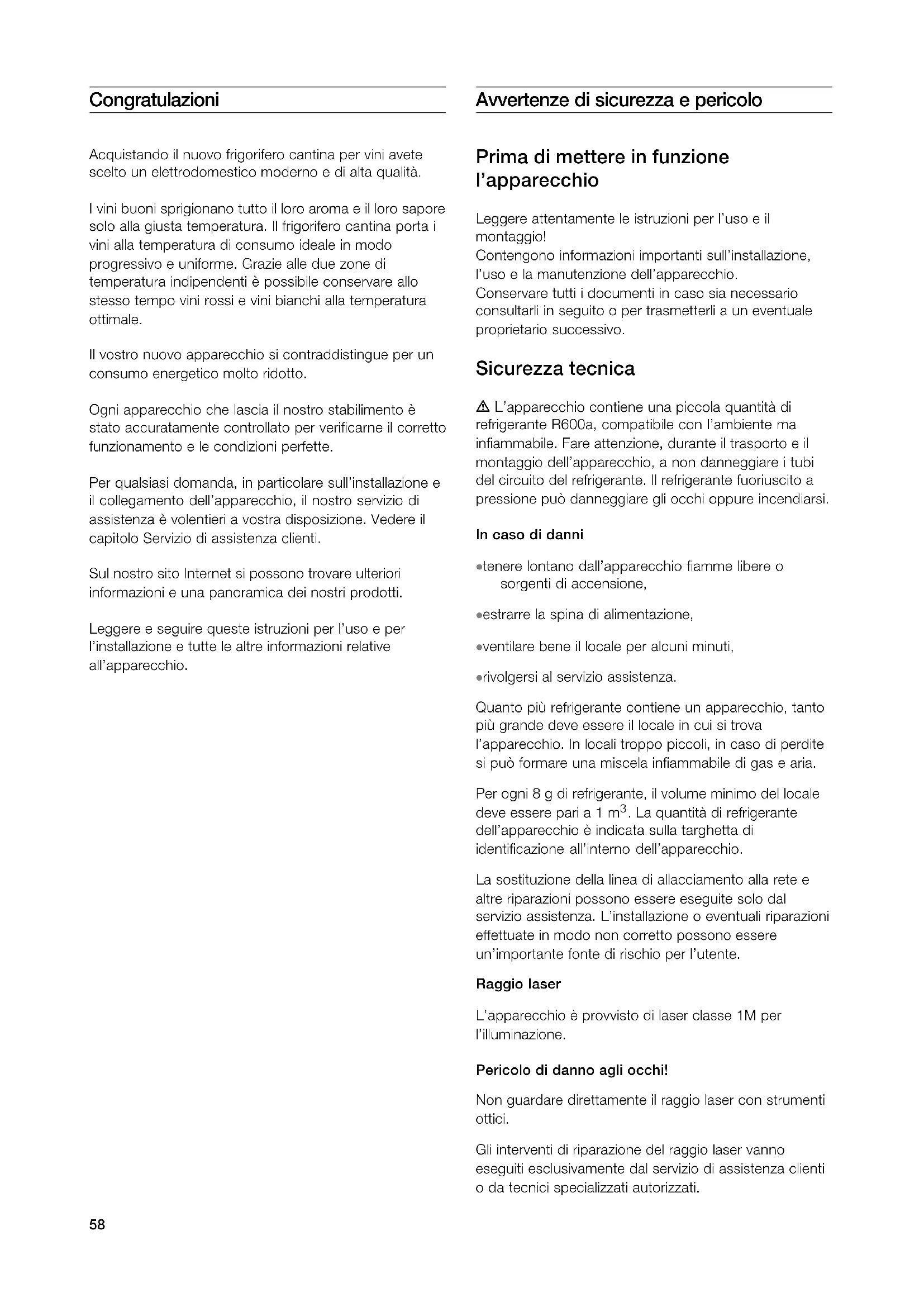 ⚠ L'apparecchio contiene una piccola quantità di refrigerante R600a, compatibile con l'ambiente ma infiammabile. Fare attenzione, durante il trasporto e il montaggio dell'apparecchio, a non danneggiare i tubi del circuito del refrigerante. Il refrigerante fuoriuscito a pressione può danneggiare gli occhi oppure incendiarsi.