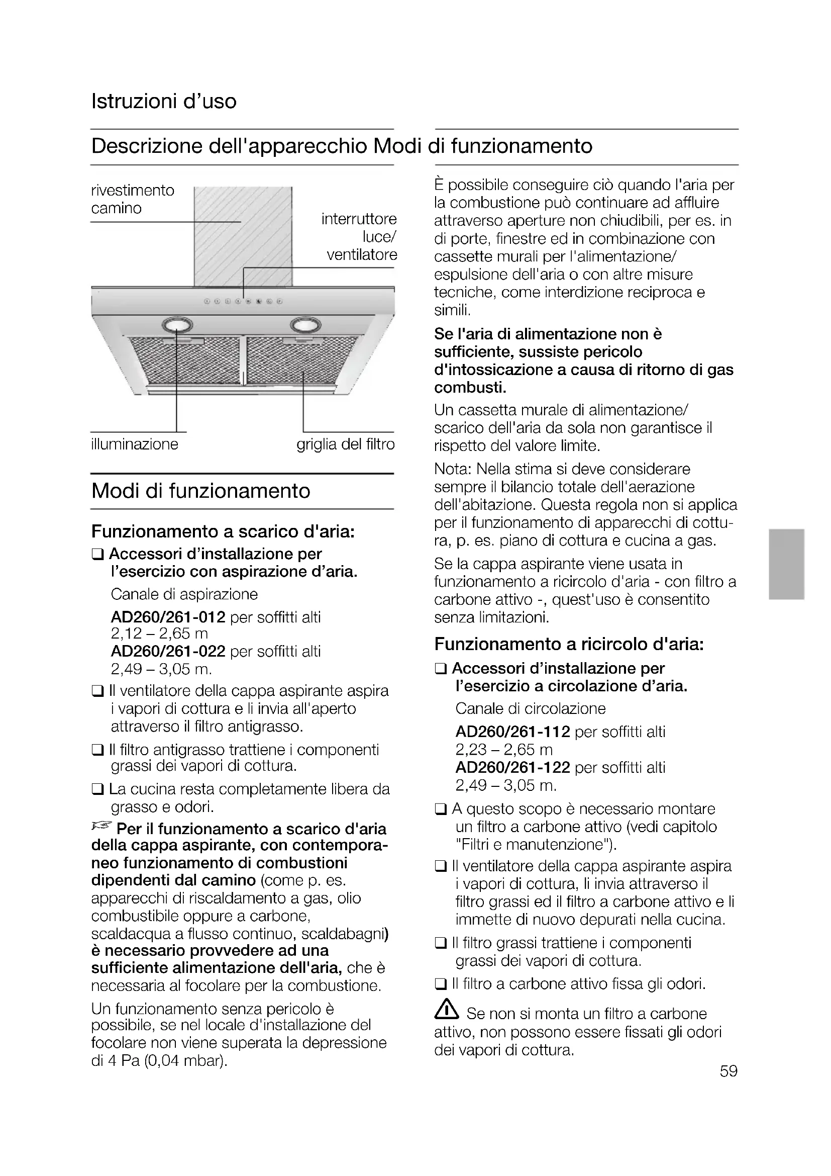 Per il funzionamento a scarico d'aria della cappa aspirante, con contempora- neo funzionamento di combustioni dipendenti dal camino (come p. es. apparecchi di riscaldamento a gas, olio combustibile oppure a carbone, scaldacqua a flusso continuo, scaldabagni) è necessario provvedere ad una sufficiente alimentazione dell'aria, che è necessaria al focolare per la combustione. Un funzionamento senza pericolo è possibile, se nel locale d'installazione del focolare non viene superata la depressione di 4 Pa (0,04 mbar). È possibile conseguire ciò quando l'aria per la combustione può continuare ad affluire attraverso aperture non chiudibili, per es. in di porte, finestre ed in combinazione con cassette murali per l'alimentazione/ espulsione dell'aria o con altre misure tecniche, come interdizione reciproca e simili. Se l'aria di alimentazione non è sufficiente, sussiste pericolo d'intossicazione a causa di ritorno di gas combusti. Un cassetta murale di alimentazione/ scarico dell'aria da sola non garantisce il rispetto del valore limite. Nota: Nella stima si deve considerare sempre il bilancio totale dell'aerazione dell'abitazione. Questa regola non si applica per il funzionamento di apparecchi di cottu- ra, p. es. piano di cottura e cucina a gas. Se la cappa aspirante viene usata in funzionamento a ricircolo d'aria - con filtro a carbone attivo -, quest'uso è consentito senza limitazioni. Funzionamento a ricircolo d'aria: ❑ Accessori d’installazione per l’esercizio a circolazione d’aria. Canale di circolazione AD260/261-112 per soffitti alti 2,23 – 2,65 m AD260/261-122 per soffitti alti 2,49 – 3,05 m. ❑ A questo scopo è necessario montare un filtro a carbone attivo (vedi capitolo "Filtri e manutenzione"). ❑ Il ventilatore della cappa aspirante aspira i vapori di cottura, li invia attraverso il filtro grassi ed il filtro a carbone attivo e li immette di nuovo depurati nella cucina. ❑ Il filtro grassi trattiene i componenti grassi dei vapori di cottura. ❑ Il filtro a carbone attivo fissa gli odori. Se non si monta un filtro a carbone attivo, non possono essere fissati gli odori dei vapori di cottura. Istruzioni d’uso illuminazione interruttore luce/ ventilatore griglia del filtro rivestimento camino